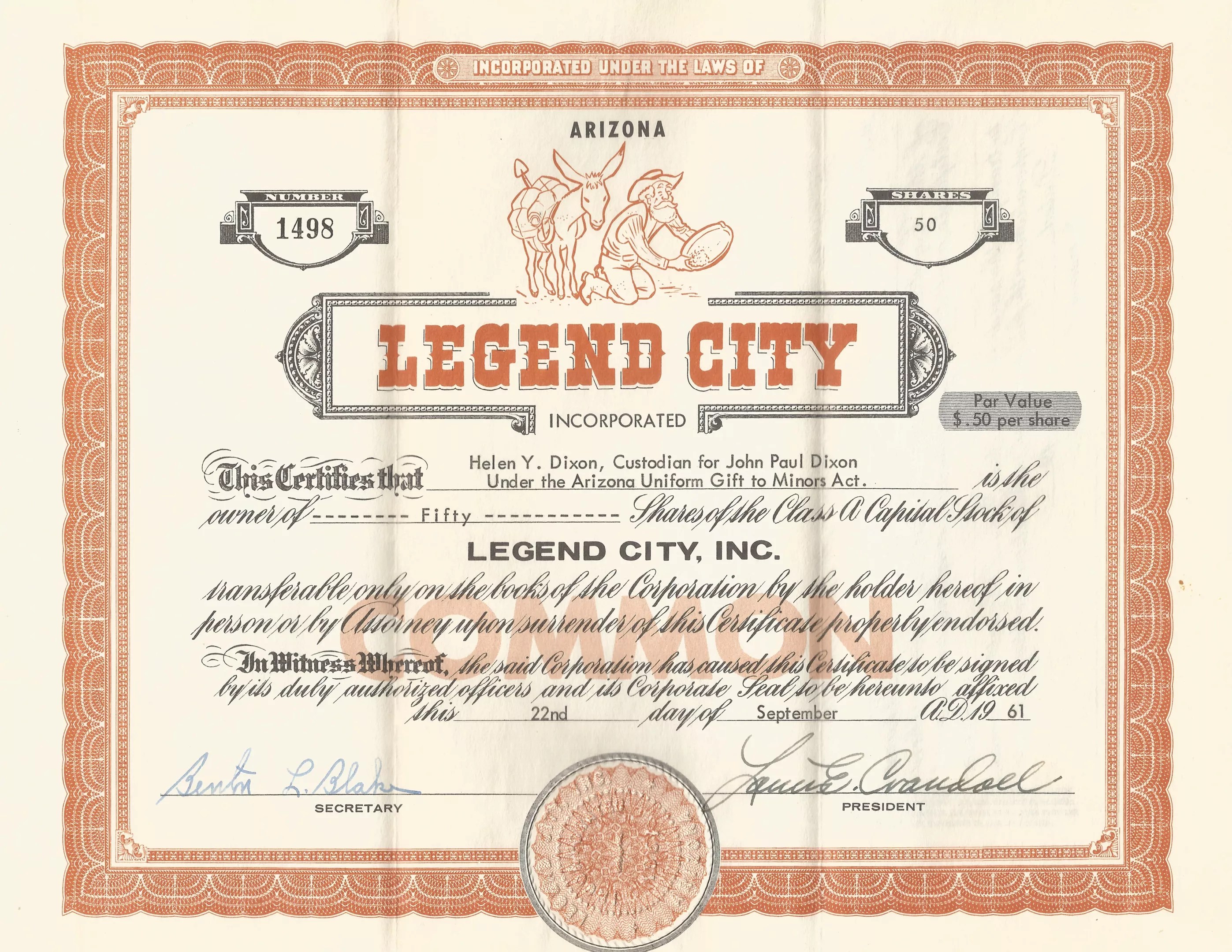 A certificate for stocks in Legend City sold to raise capital for the park’s construction.