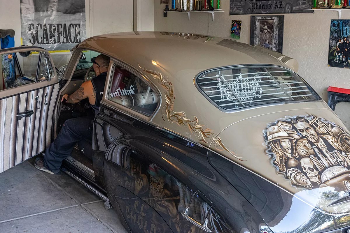 Those feelings cover every inch of Tony’s 71-year-old Chevrolet, which rests inches from the pavement when he lets it all the way down. His painting style mimics 19th-century Mexican artist Jose Guadalupe Posada; his sorrow is told in airbrushed browns and tans and blacks and peopled by buxom women and shady characters with skeleton faces. Firearms figure prominently.