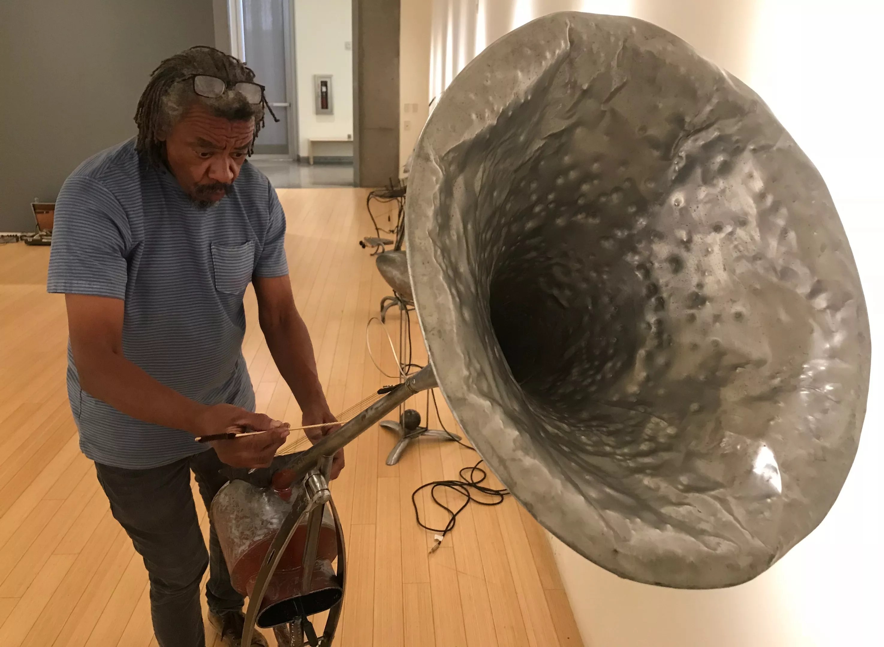 Joe Willie Smith plays on one of several sound sculptures while installing his “Ko Mo – Not Knowing” exhibition.