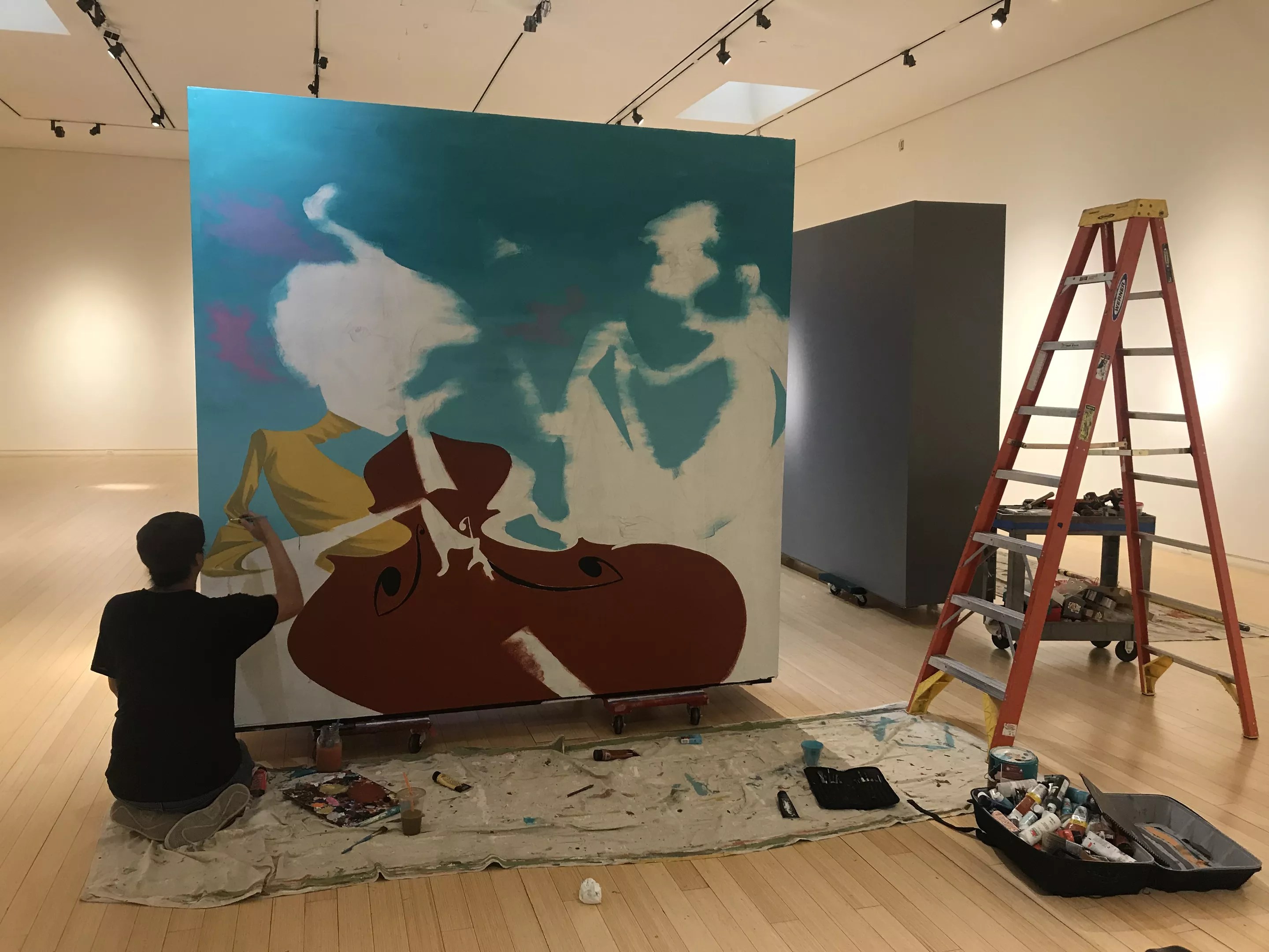 “I like painting bass players because the bass has an interesting shape and I can play with warping it out,” Caraveo says. Before painting his mural on a portable gallery wall, Caraveo sketched out his design in pencil, sitting on a rolling office-style chair.