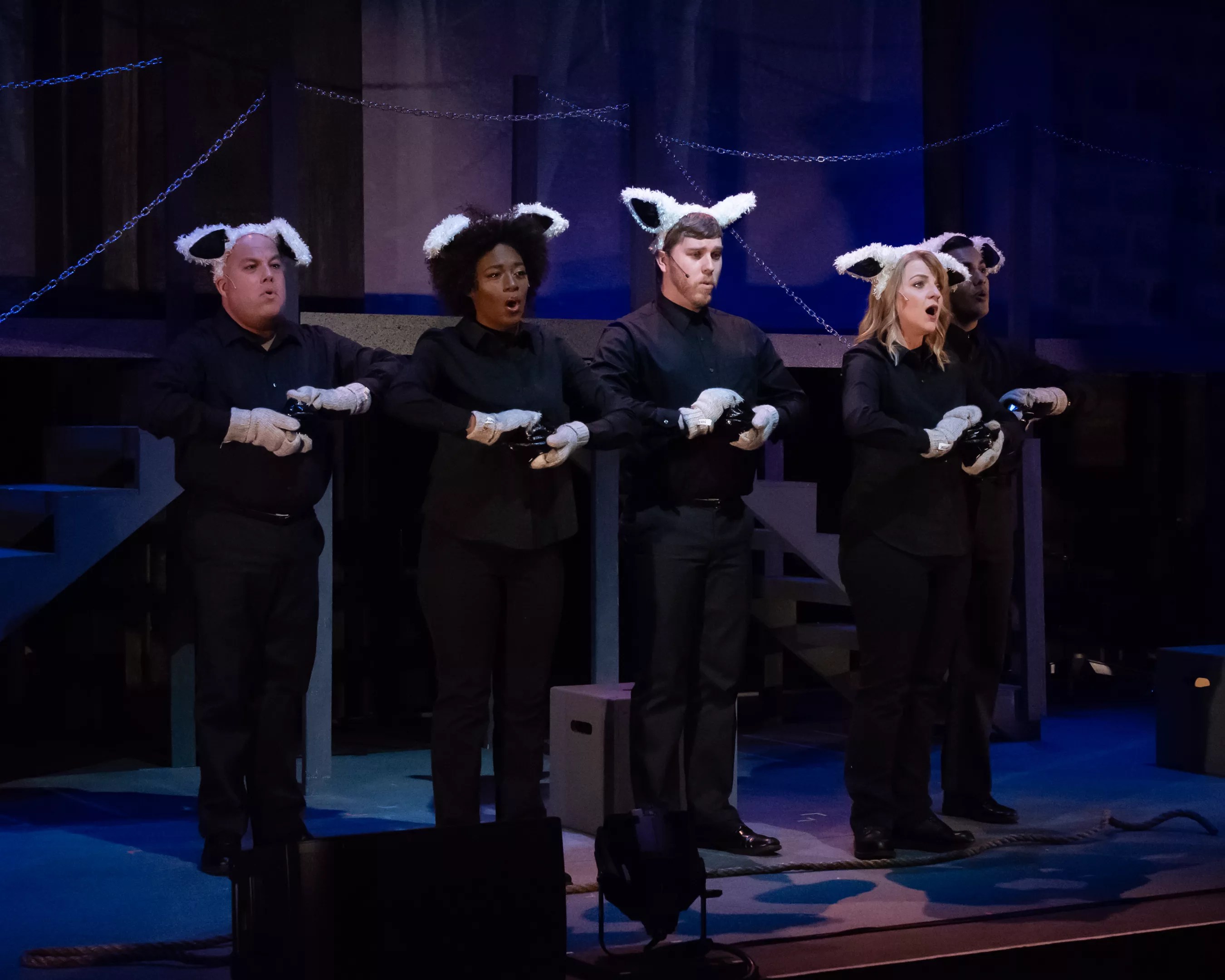 Scott Schmelder gives Lecter a droll, expressive face, neat comic timing, and a hokey British accent that never falters. He’s also in excellent voice. As Clarice, Brandi Bigley is appropriately deadpan and earnest, her sideways impersonation of Foster keen enough to be amusing. Both receive terrific comic support from the ensemble, most notably Cassie Chilton as both a kidnap victim and her mother, and whose solo is the aural high point of the show.