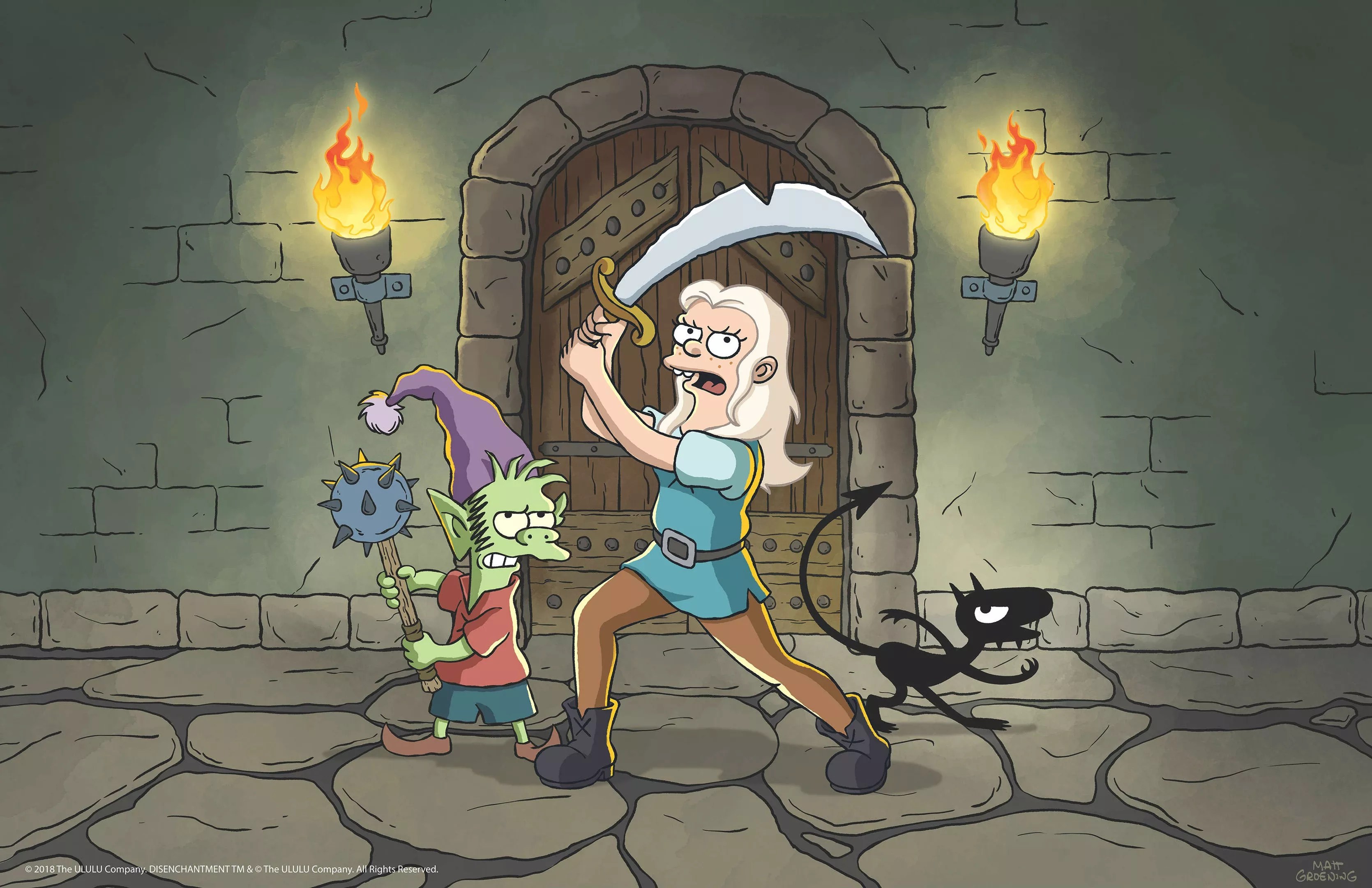 Again and again, Disenchantment seems uncertain what we should care about. Those serialized episodes tend to be the strongest, as their stories at least offer clear stakes. In between, the series fritters: When the king goes out of town, Bean throws a party, accidentally inviting Vikings to seize the kingdom and murder many of her people. The event has little consequence, save an expertly performed see-it-coming gag about the king (voiced by Futurama‘s John DiMaggio) getting avalanched with severed limbs Bean has hidden away in her last-minute cleanup. That, too, is an update of the oldest comedy routines, but it’s staged and acted with brio; more often, Disenchantment‘s gags tend toward the rote or desperate, with an unfortunately high percentage of them riffs on the old Simpsons/Family Guy Hail Mary of something not especially funny going on so long that it maybe wins you over.