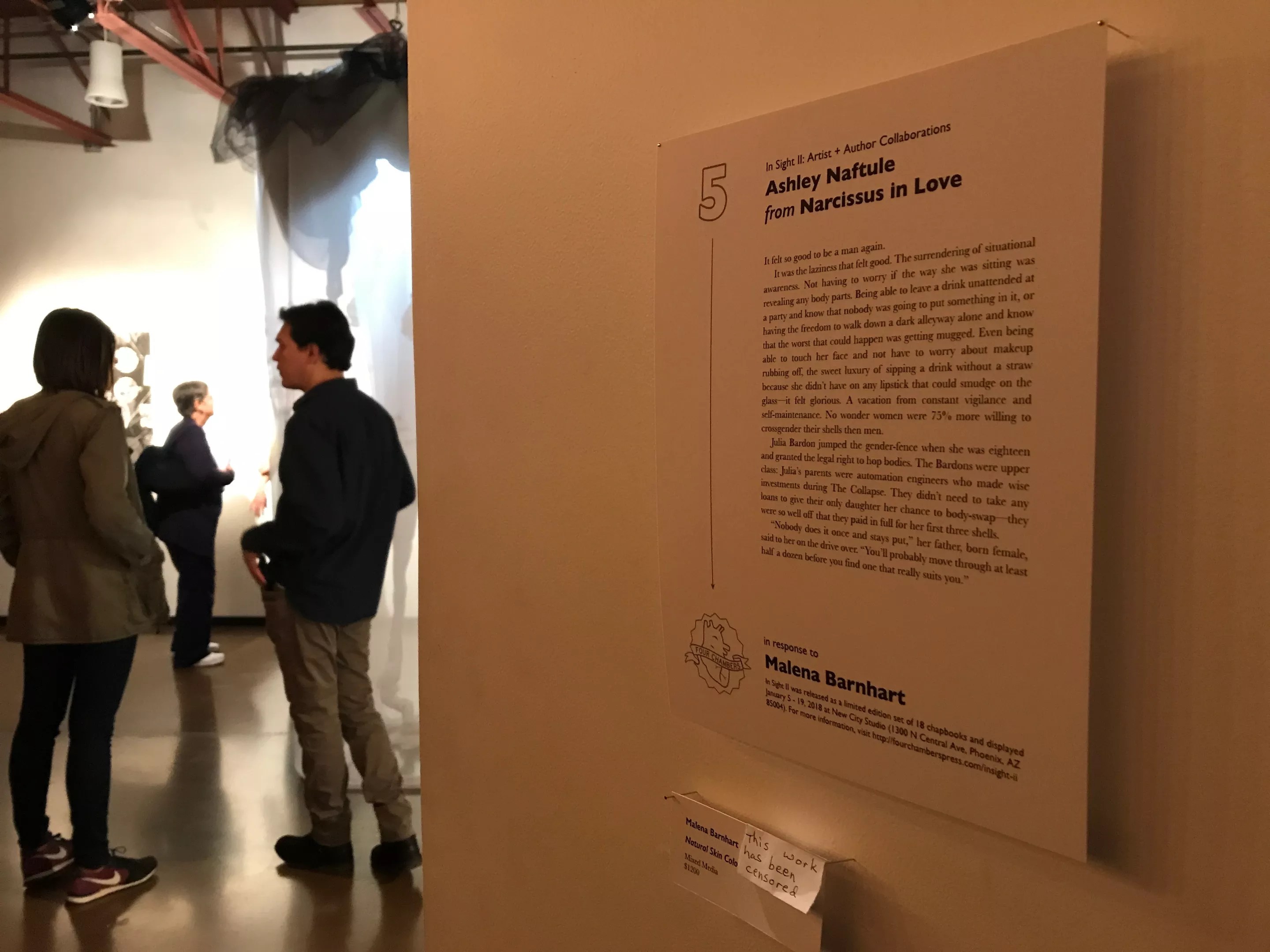 During Friday’s opening reception, Phoenix poet laureate Rosemarie Dombrowski and three additional writers turned out to protest the fact the Barnhart’s work was excluded from the show. Two of those writers have works in the show. Kat Hofland was partnered with artist Cydnei Mallory for the “In Sight II” project, and Sophia McGovern worked with artist Dani Godreau.