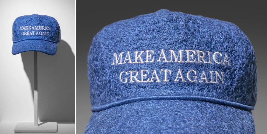 Ann Morton, Blue MAGA, official "Donald J. Trump Make America Great Again Hat - Red Red Cap/Red", blue embroidery floss, 8 x 10.5 x 6 inches, unique.