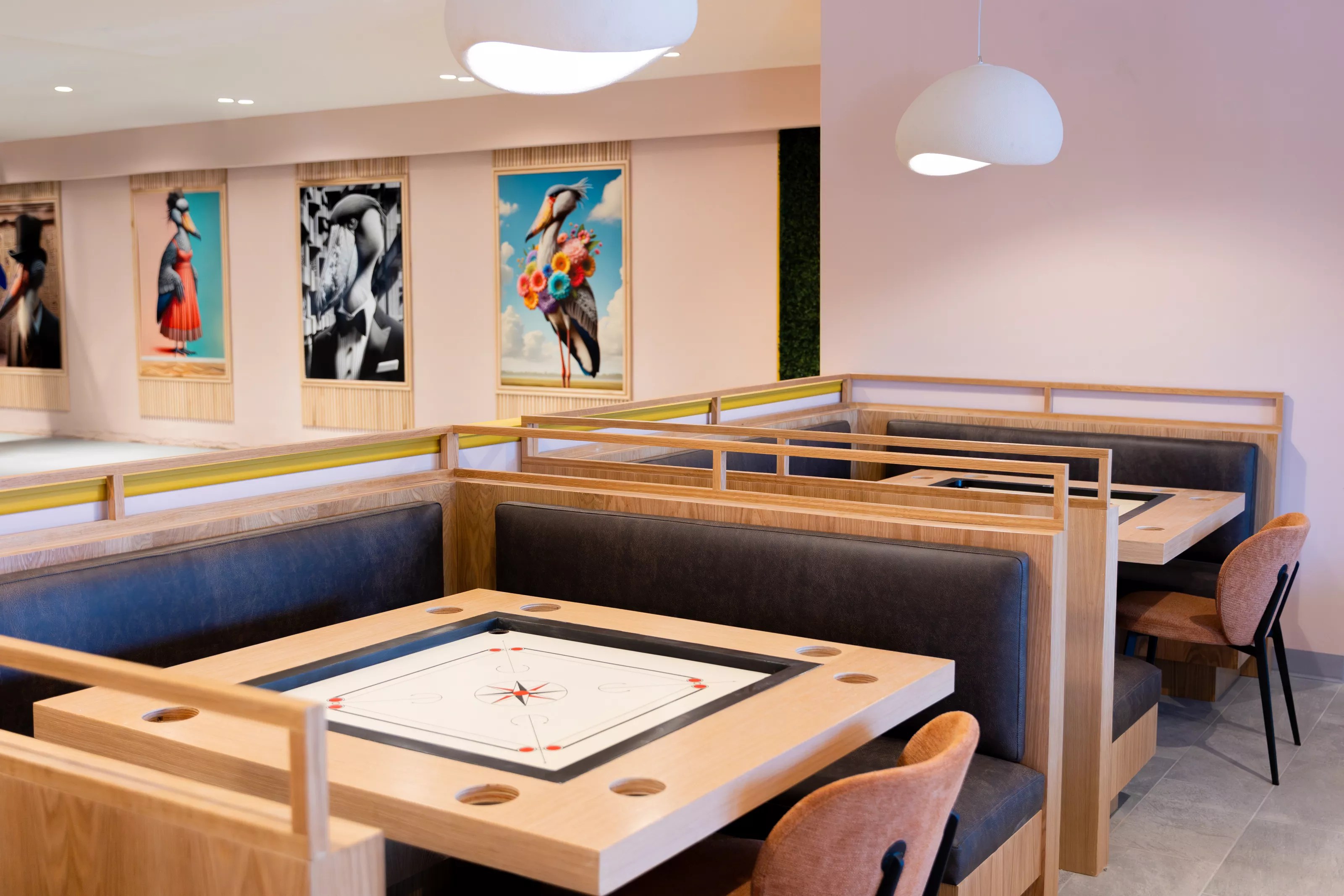 “Carrom is a 1,000-year-old game from India that is similar to billiards in the fact that you have black or white chips and you try to get them in pockets in the table. You finish with getting the centerpiece – the red chip – in. They are built into the lounge booths,”he explains.