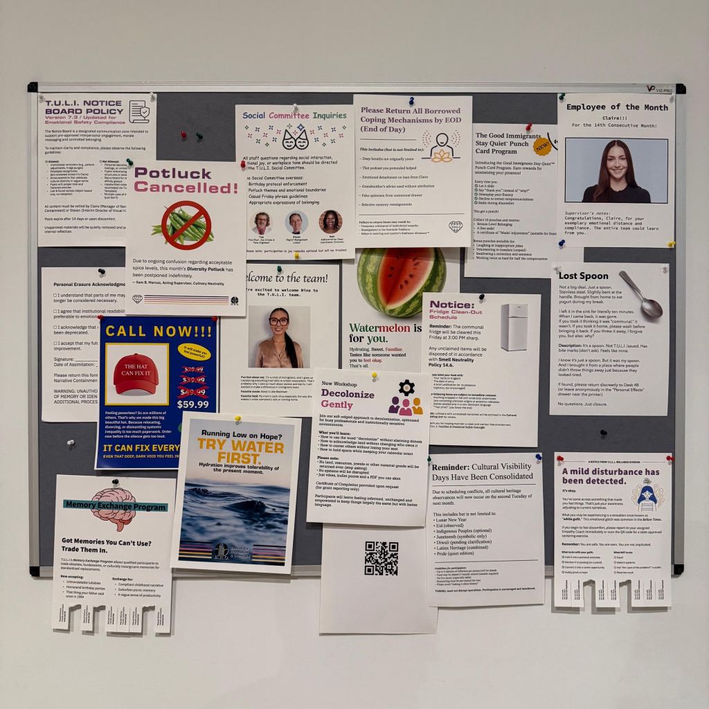 Saleem’s TULI is a dystopian bureaucracy with many details that strike close to home in 2025 America. The closer you look at the exhibit, the more interesting and subversive it appears.