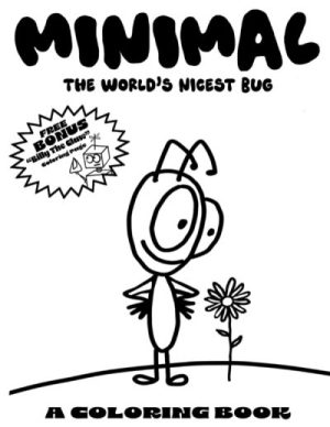 The bug’s name, Minimal, is fitting for its style — a simple, thick black body outline housing its cute antennae, big eyes and upbeat smile. The book features Minimal engaging in various activities that your crayons or markers can bring color and ink to, as your imagination sees fit.