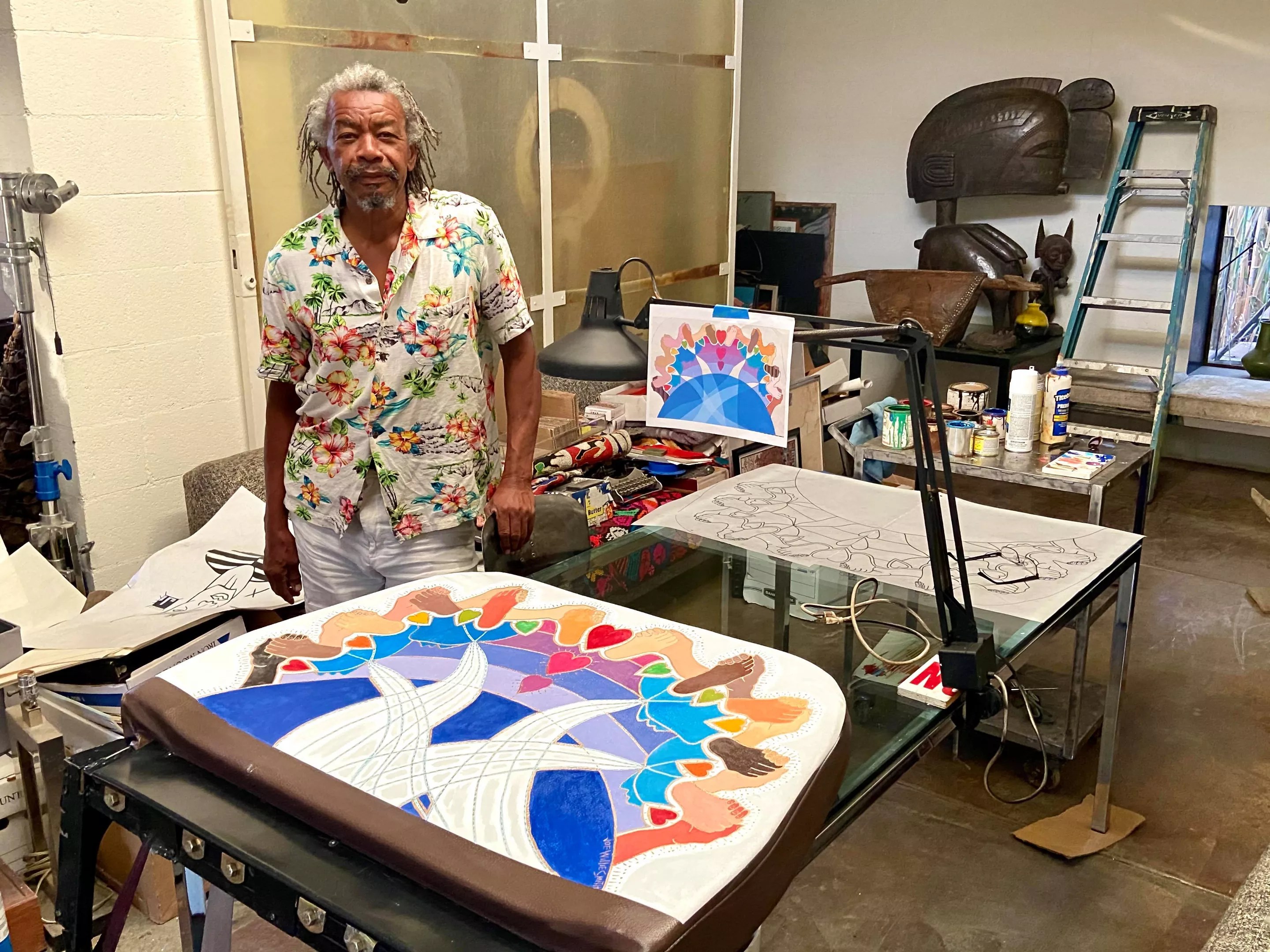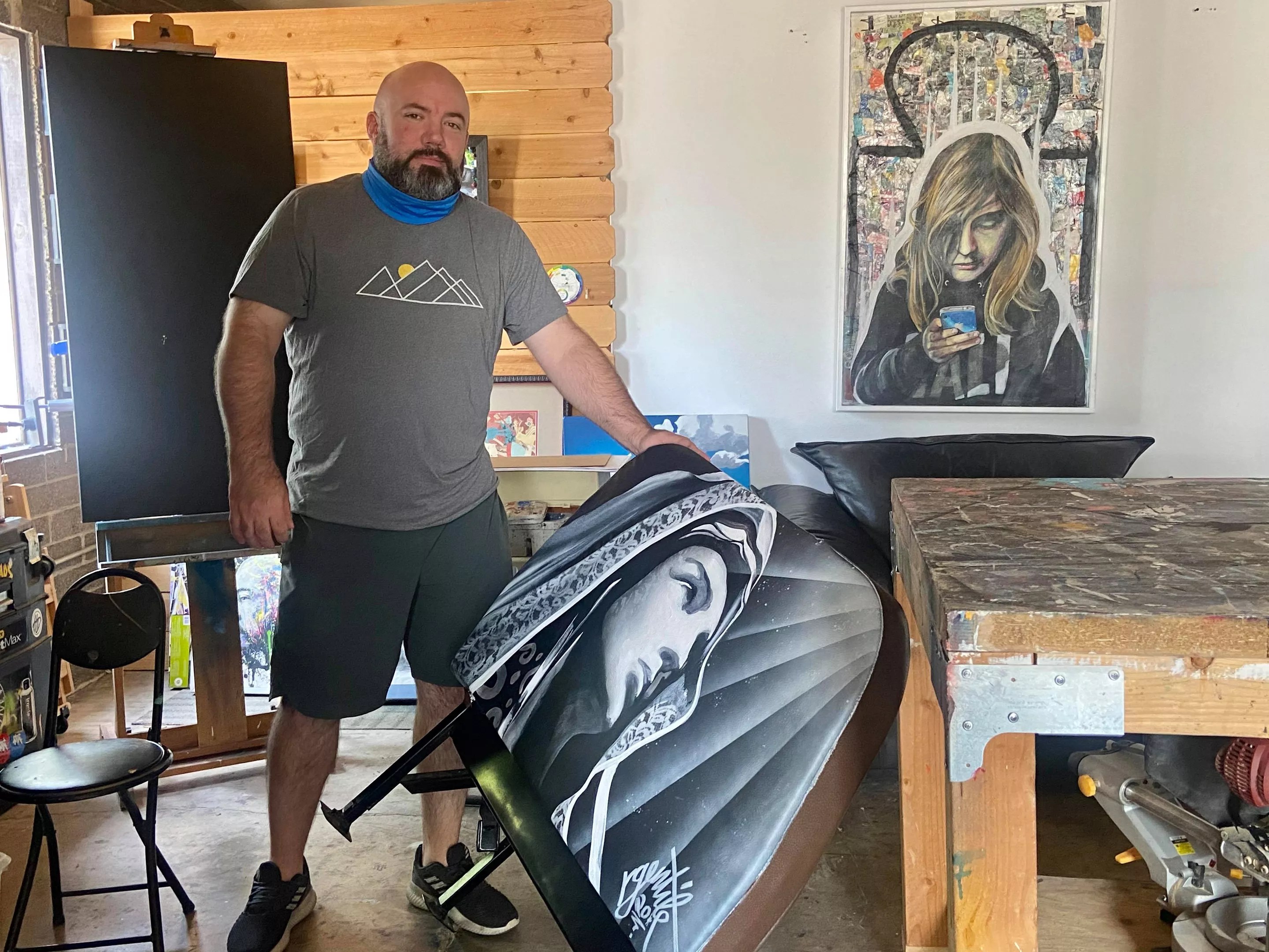 Robert Gentile with the seat he painted for the “Let’s Be Better Humans” bus.
