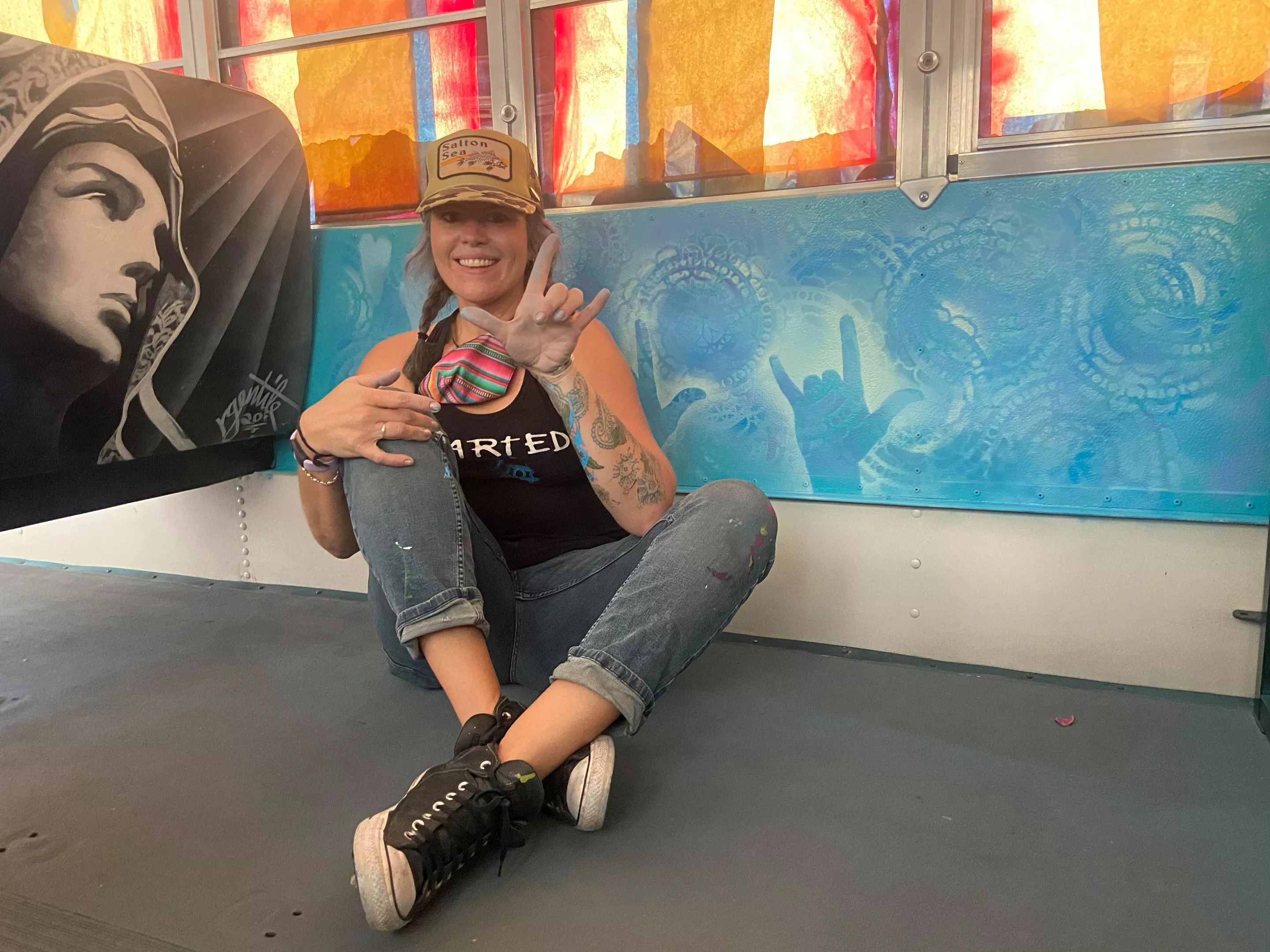 Kristin Wesley relaxes with her work inside the “Let’s Be Better Humans” bus.