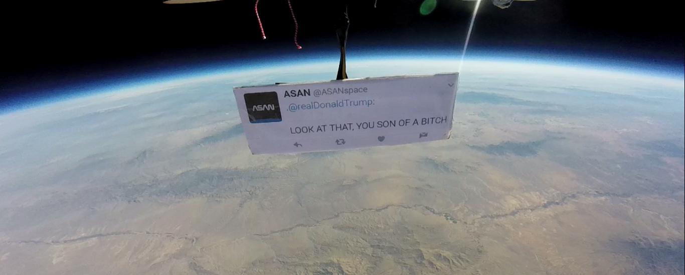 A local collective calling itself the Autonomous Space Agency Network last week launched a weather balloon into the stratosphere, with a message aimed down below to our commander in chief.