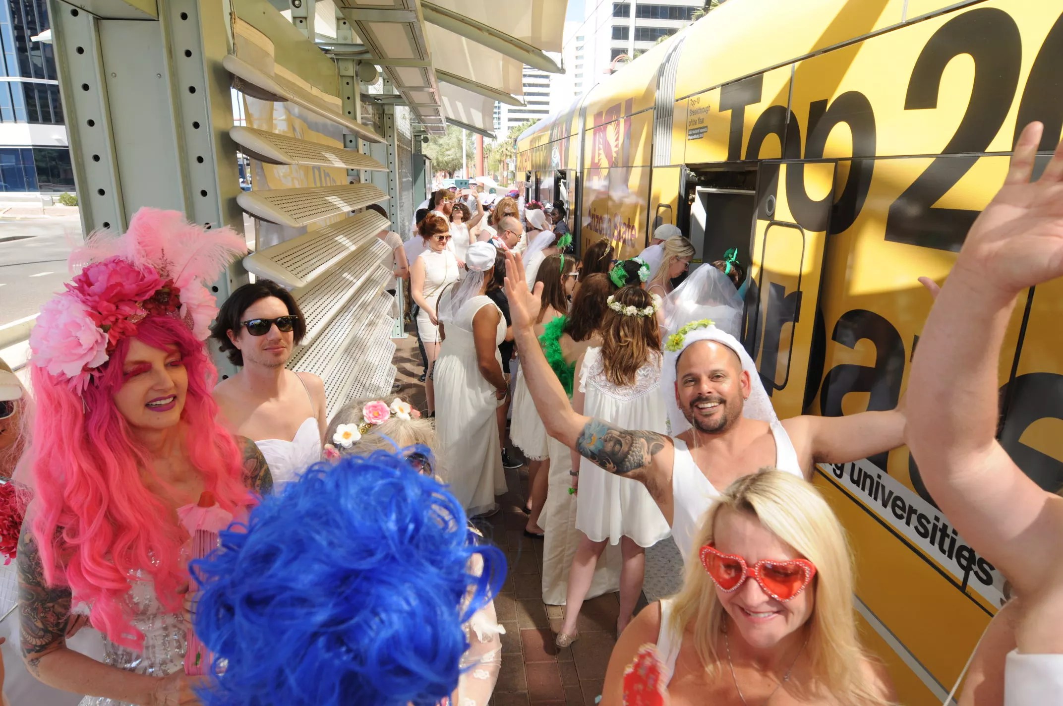 Now, picture that scene with a madcap, boozy twist, and you’ve got the annual Brides of March in downtown Phoenix – a gonzo, costumed bar crawl where people of all gender identities don thrift-store wedding gowns and visit drinkeries along the light rail.