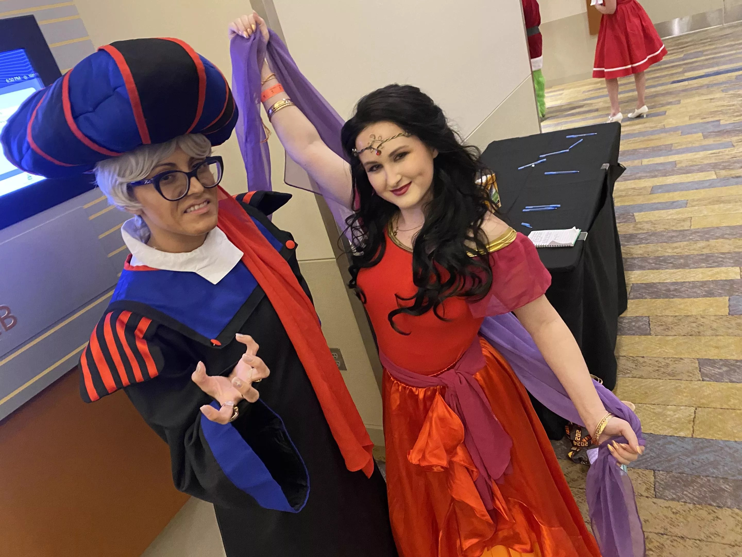 A group of nine people participated in this group cosplay, which depicted each of the various evolutions of Eevee from Pokemon. During the annual cosplay masquerade on Saturday night, they stole the show with a high-energy song and dance number showcasing moves from various decades and some delightful costumes. It may not have won any awards, but it was decidedly fun. Vanity Lang (left) as Judge Claude Frollo and Rage the Gemini (right) as Esmeralda. Benjamin Leatherman
