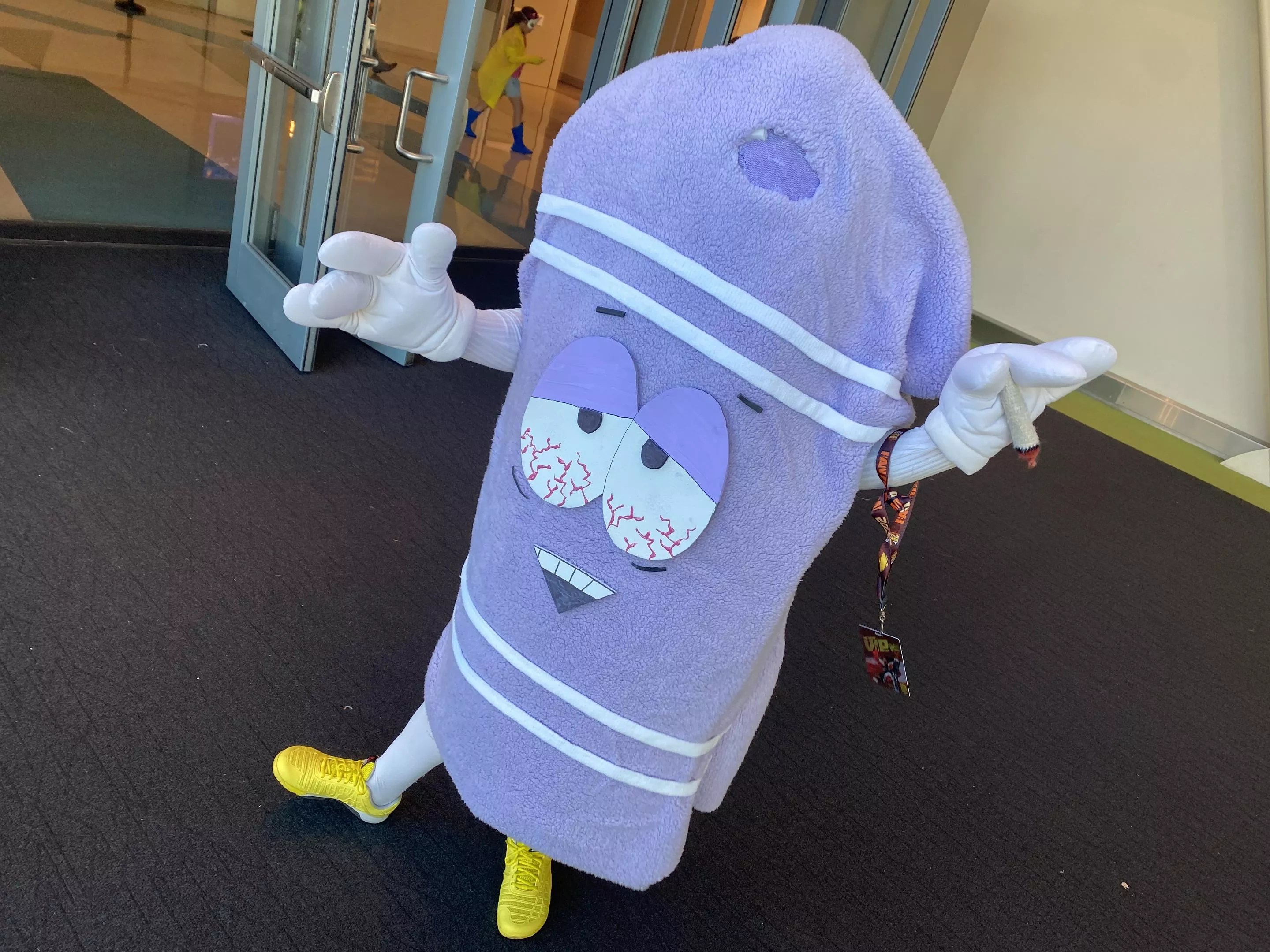 Fans of “South Park” will recognize Karla Puente’s cosplay of Towelie, the perpetually stoned character who appeared in multiple episodes of the legendary animated show. Consisting in an oversized blue towel with googly (and suitably bloodshot) eyes, she wandered the convention offering advice and catchphrases like, “Don’t forget to bring a towel!” Fellow attendees were definitely amused. Analia Valentin, Edward Valentin and Tim Valentin cosplayed The Powerpuff Girls. Benjamin Leatherman