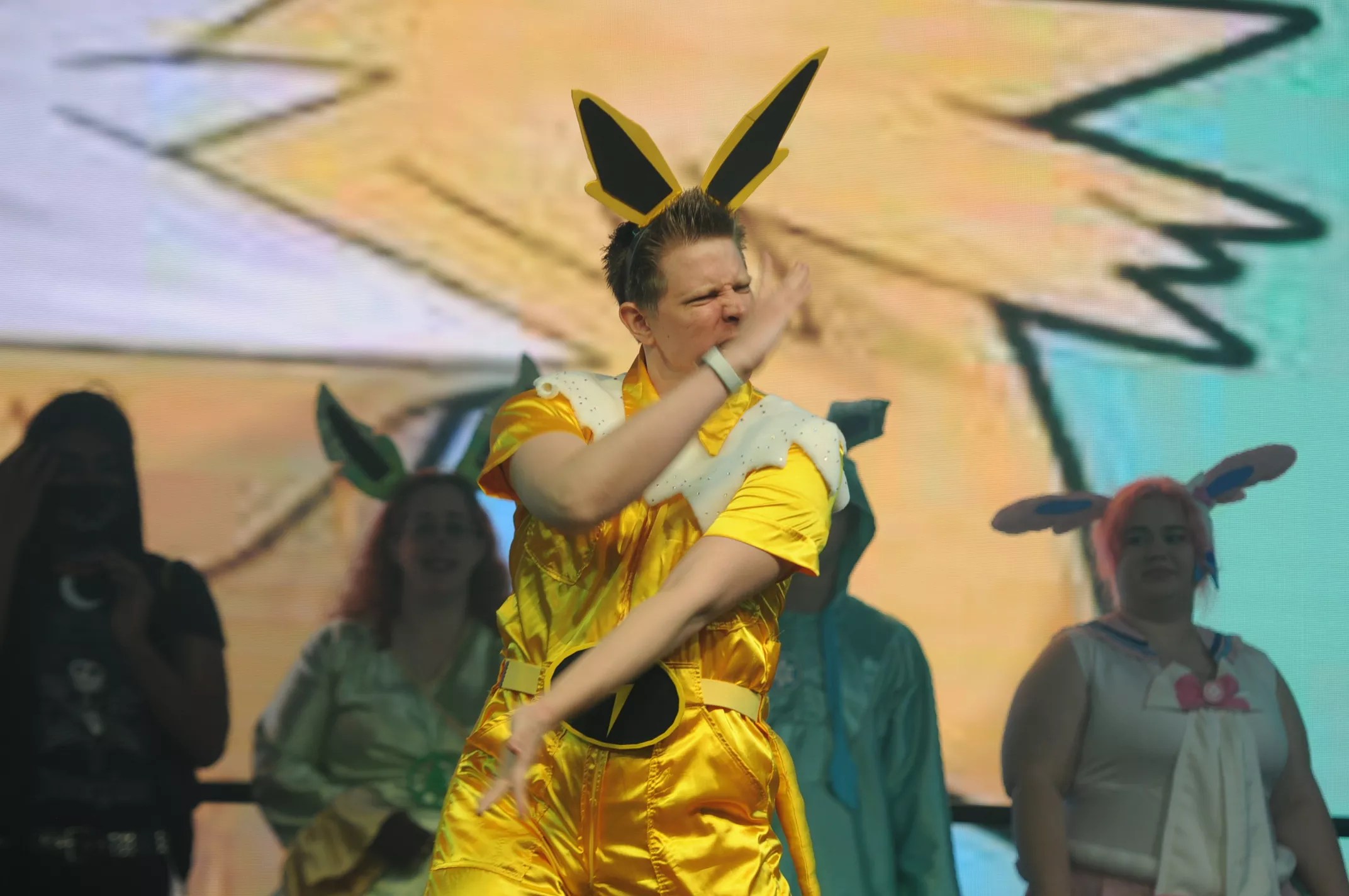 A Jolteon cosplayer shows off his moves during the performance by Dance Dance Eeveelutions.
