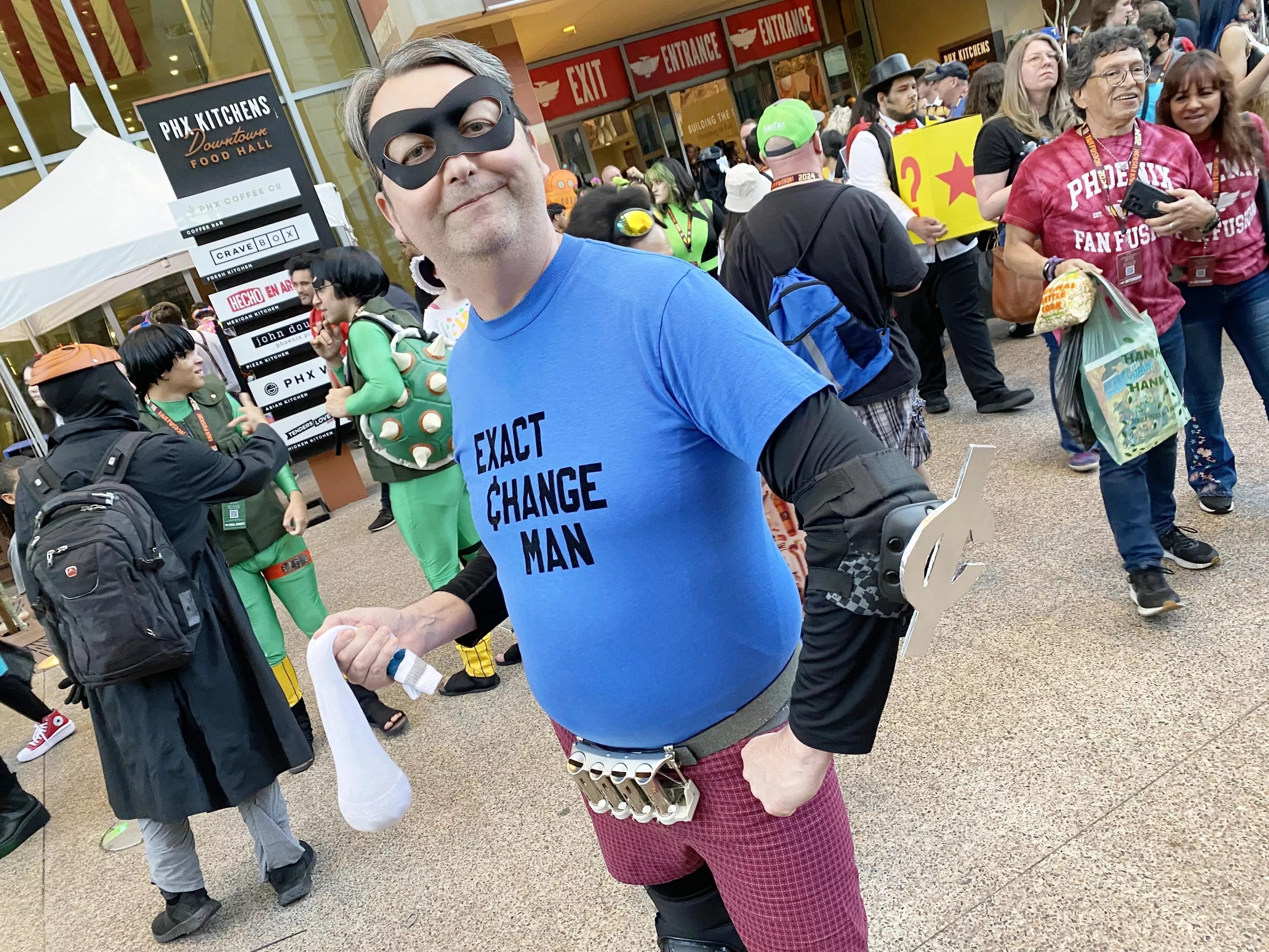 Greg Nadeau’s costume depicting pitcher Ricky “Wild Thing” Vaughn from the 1989 sports comedy film “Major League” stood out at Fan Fusion, not just because he was portraying a jock hero at a well-known hangout for geeks. It was the first time we’ve ever encountered the character being cosplayed at Fan Fusion or elsewhere, which makes it unique. Nadeau says he made Vaughn’s signature eyewear himself, gluing a skull and crossbones pendant onto a pair of horned-rimmed glasses. Brian Baker as Exact Change Man. Benjamin Leatherman