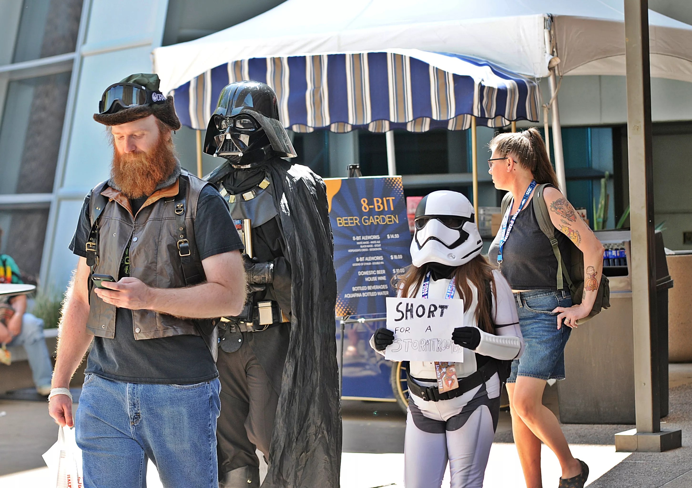 There were a few glitches found with the Arcade Oasis, primarily with the state of some of the hardware. When we played “Time Crisis,” the Namco first-person rail shooter we enjoyed playing at a nickel arcade as kids, the gun controller and foot pedal were not calibrated correctly, resulting in the game being stuck in a menu loop. (Even the classic “turn it off and back on” trick didn’t help.) By the end of the weekend, a few custom controllers on the NES games – including the original “Mega Man” – had stopped working. Eric Vanderwall The acquisition of food is always a headache at Phoenix Fan Fusion. Around mealtimes, the lines for sustenance are long, slow-moving and utterly frustrating. But we’ve cracked the cheat code to getting fed quickly at Fan Fusion. The Public Pantry Grab and Go Market is an oasis on the ground level of the West Building. Just as the title implies, it sells drinks, salads and sandwiches that you choose from a refrigerated case, plus chips, candy and other little snacks. Our turkey and Swiss sandwich was nothing to write home about, and it didn’t cost any less than options in the food hall, but when we were hungry and needed something quick before a panel, it was by far the best option. Jennifer Goldberg Cosplayers from the Arizona Avengers pose with a Fan Fusion attendee at their booth. Benjamin Leatherman After a year off, the Hall of Heroes returned to Fan Fusion 2025 with a major upgrade: its own dedicated ballroom in the convention center’s North Building. Previously located within the lower level exhibitor hall, the area – which hosts booths for local costuming groups like the Marvel Comics-focused Arizona Avengers or the “Halo”-inspired Fireteam Phoenix – was a popular destination all three days. “We were worried about it being away from the (exhibitor hall), but it worked out well,” says Fireteam Phoenix’s Ben Wheat. “We had lots of traffic and did really well with our outreach.” The ballroom’s carpeting also made standing around while dressed in cosplay armor easier on the knees. “That was a plus,” Wheat says. BL The Hall of Heroes featured a massive combat cage where fighters in full medieval armor clashed with swords, axes, and shields. The clang of metal on metal, the grunts of armored warriors straining under the weight of chainmail, and the roar of the crowd-it was music to the ears of many fans. EV The Phoenix Convention Center is thankfully equipped with dozens of drinking fountains, some of which also offered bottle-refilling stations. Although you never know how clean these are – since some people placed the mouthpieces of their bottles onto the spigots without wiping first – at least there was a way to stay hydrated without having to pay exorbitant prices for bottled water. EV An enormous crowd inside the Phoenix Convention Center’s North Building on the second day of Phoenix Fan Fusion 2025. Benjamin Leatherman In a world that currently feels pretty dark and ugly, Phoenix Fan Fusion was once again an environment where people of all ages were allowed – nay, encouraged – to let their quirk flag fly. Whatever your race or sexuality or fandom, there is a place for you at the con. Whether you’ve spent thousands of dollars on an elaborate “Hazbin Hotel”-inspired cosplay or you and your friends strapped on some cardboard shells and declared yourselves Ninja Turtles, your costume is awesome and we’re glad you wore it. Because the panels and the vendors are a wonderful and essential part of the con but truth be told, we go for the people: the weird, wild, creative people who are the heart of Phoenix Fan Fusion. We’ll see you next year. JG When you put tens of thousands of people in a convention center together, traffic is going to move slowly. When you’re dressed like Bumblebee from “Transformers,” you’re going to take up extra space. None of it is ideal, but we would have gotten around Fan Fusion much easier if people would have just moved the hell out of the way. It’s driving rules, people: If you want to stop, pull over. If you’re not exactly sure where you’re going, pull over. Instead, we dealt with three days of nearly crashing into people over and over again because they thought a central walkway was the ideal place to discuss lunch options. JG We don’t get it. You know you’re going to be walking around all day in huge crowds of people at an event in Phoenix in June, and the thought of, say, starting the day off with a shower and some deodorant doesn’t cross your mind? The stinky con cliché is real, and it was in full effect this year as always. But personal hygiene at Fan Fusion reached a new low this year: We saw a guy popping his pimples while sitting at a gaming table. There are no words. JG A packed house at one of Fan Fusion 2025’s celebrity panels on Friday. Benjamin Leatherman Fan Fusion’s organizers definitely have a sense of humor. Case in point: Slides shown on giant screens in both of the two main ballroom displayed the rules for Q&A panels with fan-friendly twists. Some humorous examples: “No, don’t call me a hero. Do you know who the real heroes are? The ones who keep the aisles clear and free of clutter.” “You shall not pass … up the opportunity to ask a question if you want to!” EV We’re not here to call anyone out or to name names. It’s not always easy leading a conversation with a celeb; you don’t always know what you’ll get. Sometimes they’re not as friendly as hoped. Other times, they’re pleasant AF but you don’t keep the conversation flowing, it leads to awkward silences, and in those giant convention center ballrooms, the awkward factor cranks up to cringe level 10. Know your subject and make some choices about what questions could lead to interesting answers and weed out the others. We aren’t all Girl Scouts over here, but their “be prepared” motto is a good one to hold onto. Amy Young Some panels be