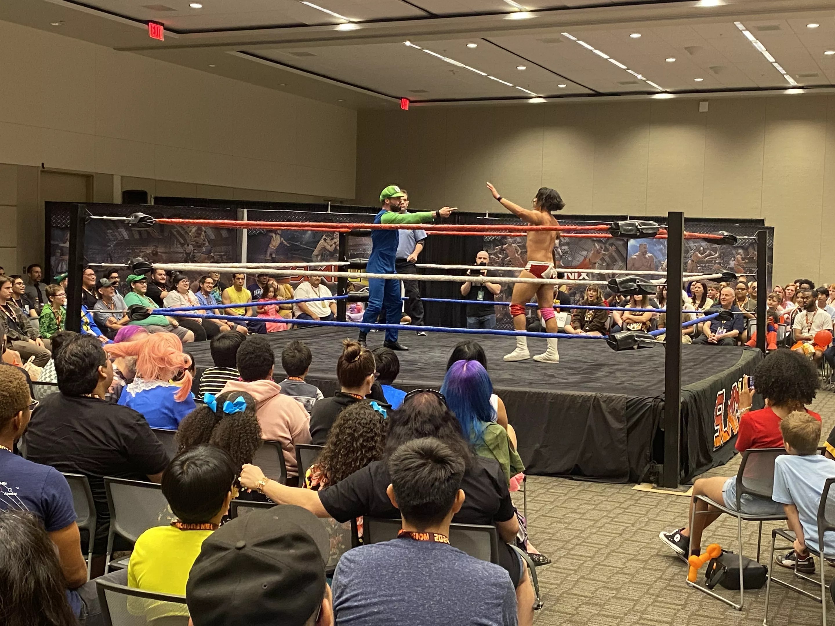 A geek-themed wrestling match at Fan Fusion 2024 featuring Nintendo’s Luigi.