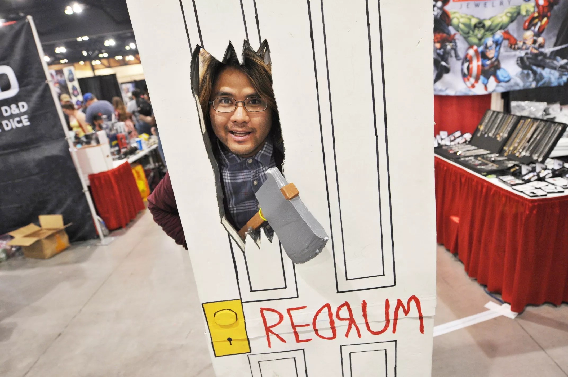 One of the most iconic scenes in horror film history became the basis for this inventive cosplay by Jamie Giang. The Salt Lake City man used a full-sized bathroom door made from foam core boards to mimic the famous moment in The Shining where a deranged Jack Nicholson chopped his way through with an ax. He also dressed up as the character and scrawled “REDRUM” across the door for added effect.