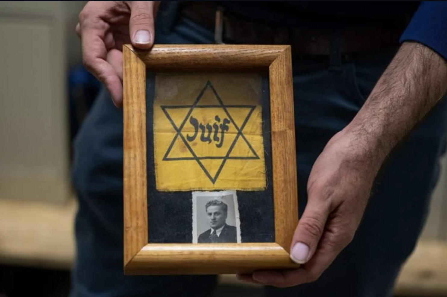 A yellow star worn during the Holocaust is accompanied by a photo of the man who wore it.