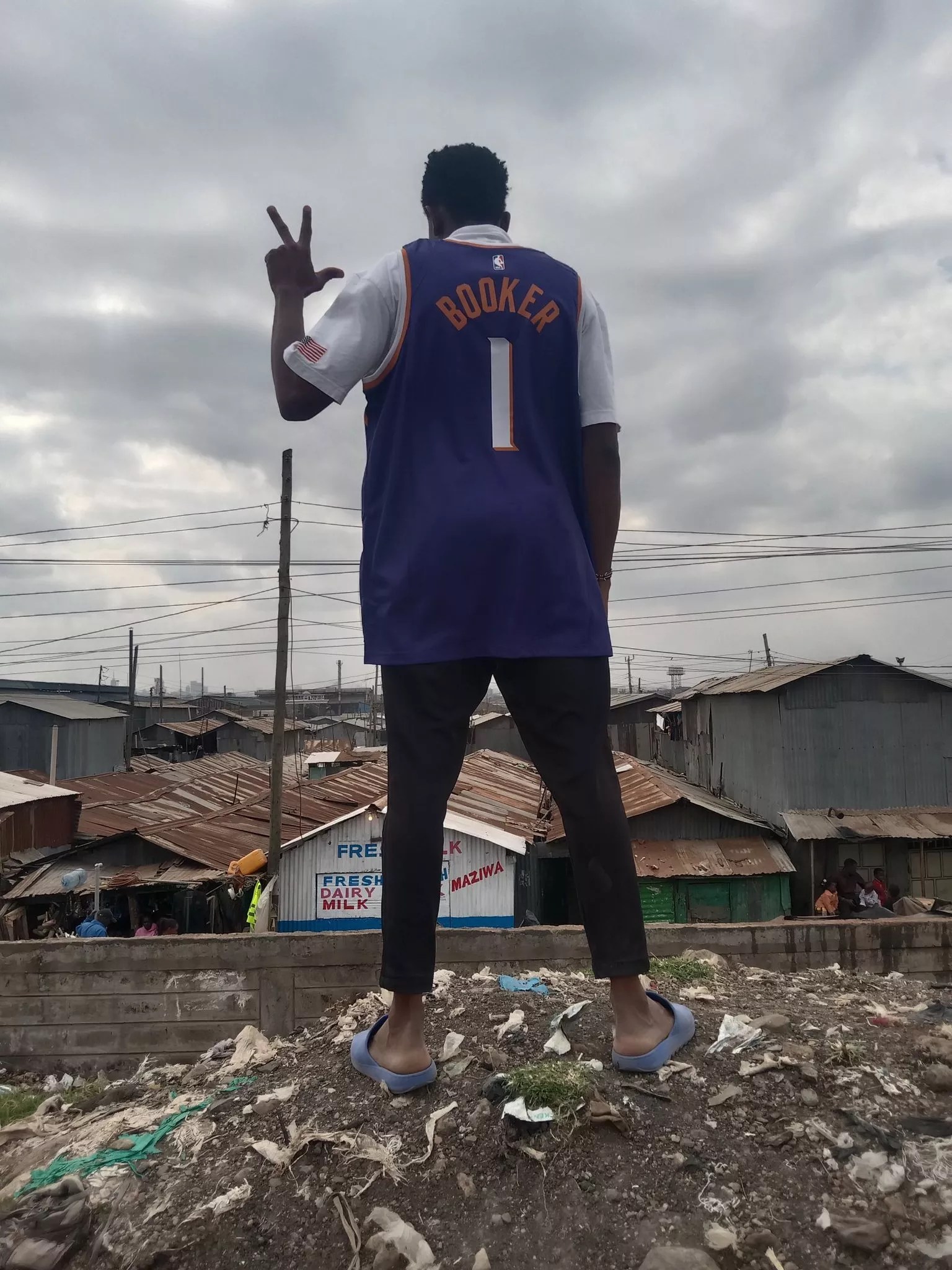 Hussein Siro flashes the signature 3-point gesture while wearing his new Devin Booker jersey in Nairobi, Kenya, on Sept. 2, 2024, a gift from the Phoenix Suns community.