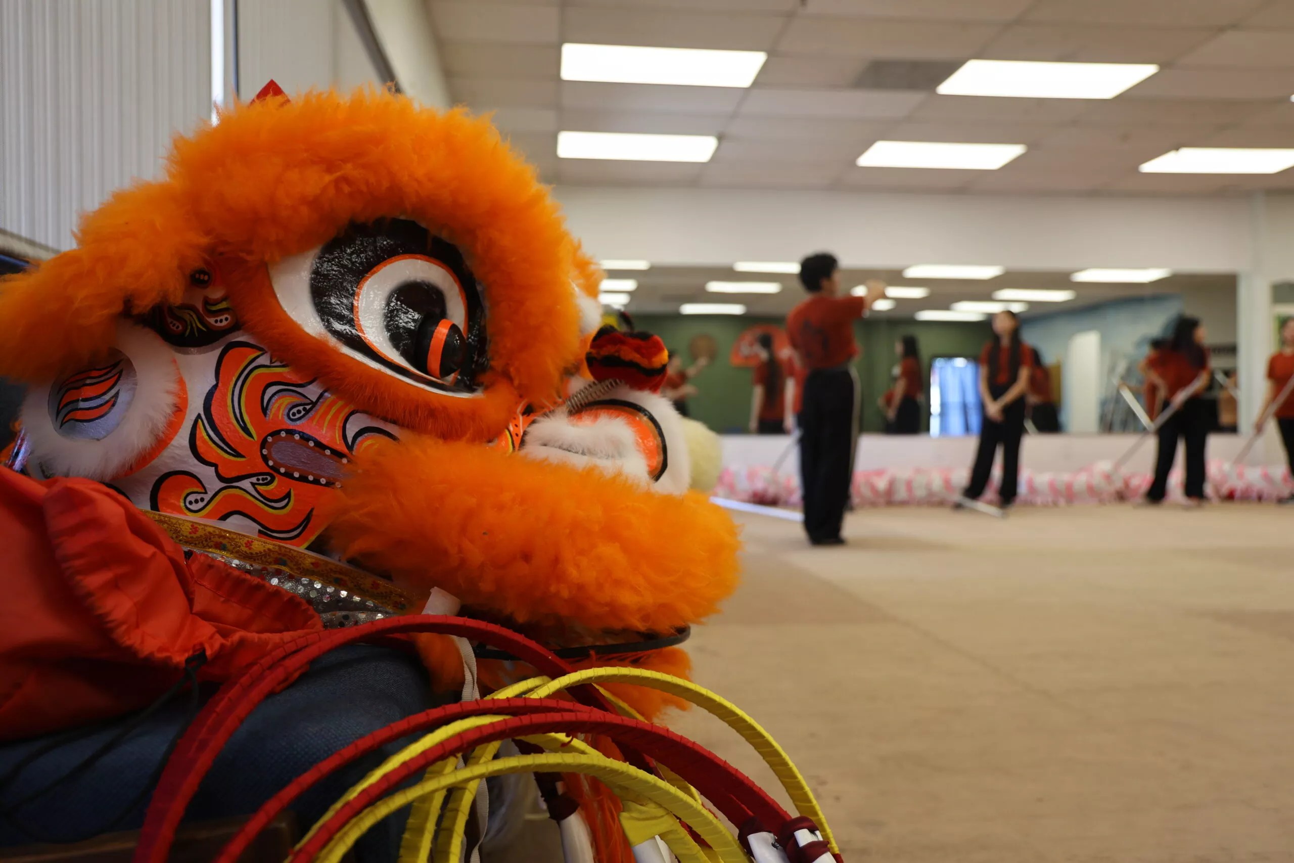 One of Golden Phoenix Lion Dance Arts and Athletic Association’s lions, ChéngChéng (Orange in Chinese), rests on the bench as the team practices.