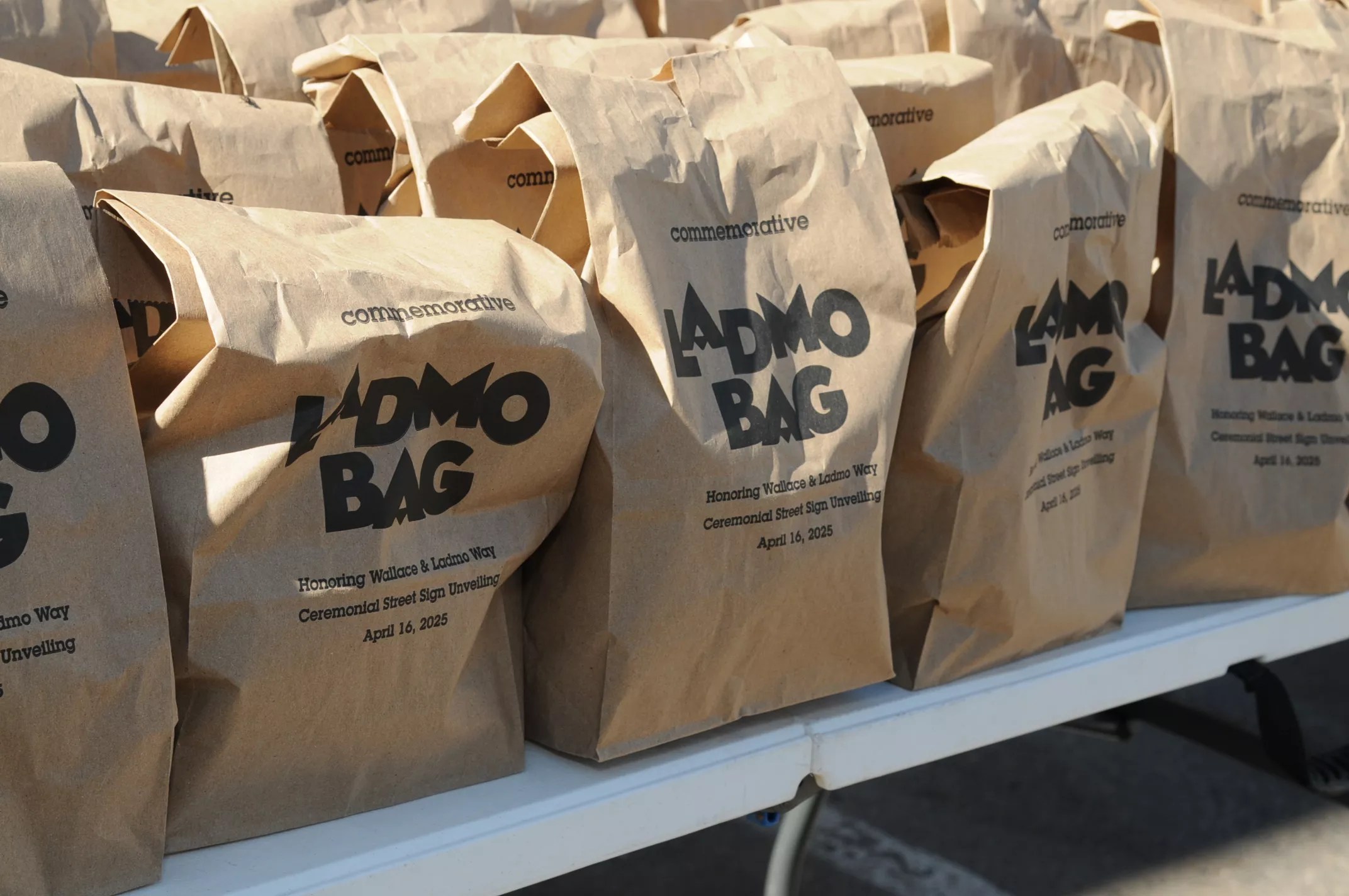 A table filled with Ladmo Bags that were given out to attendees of the ceremony.
