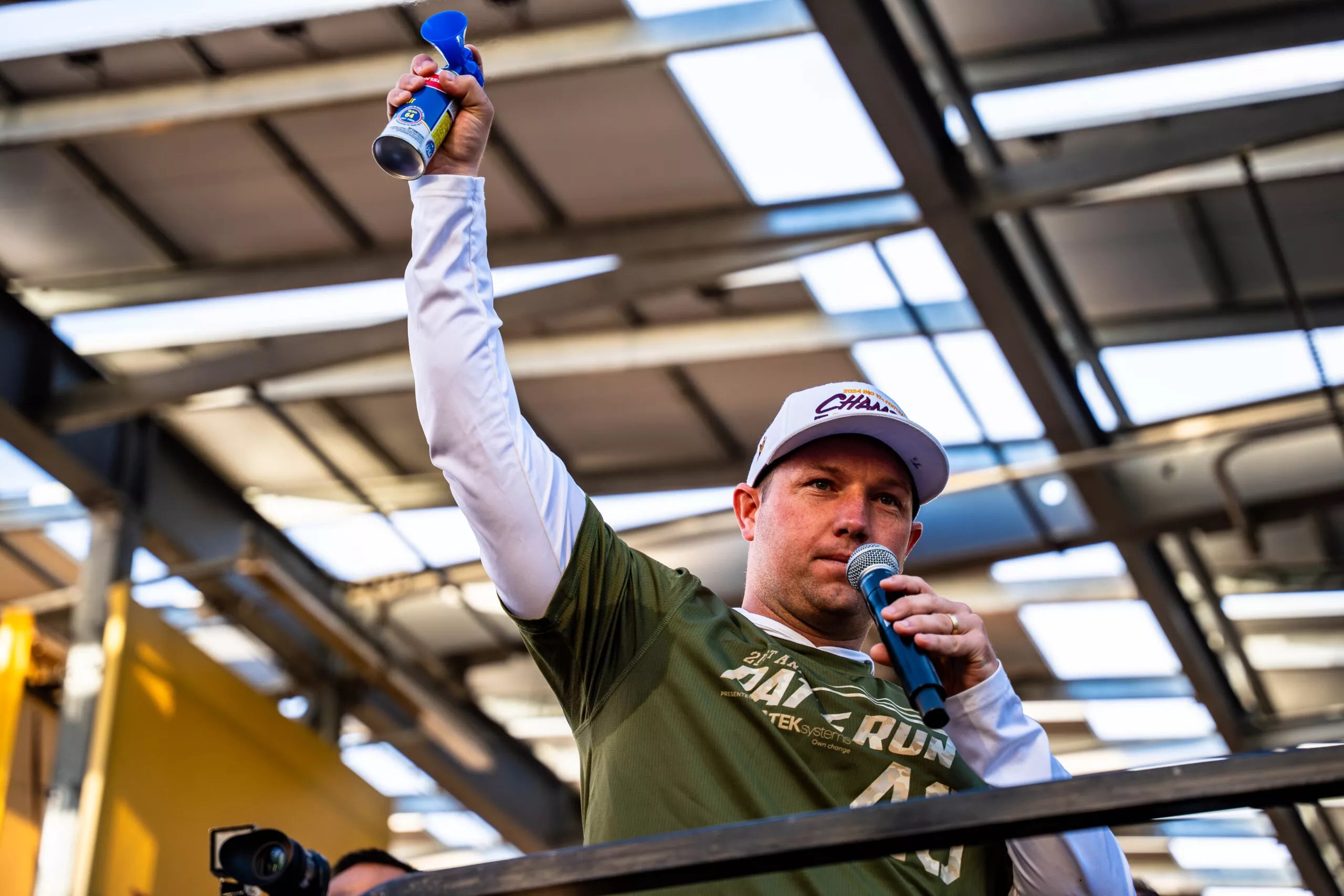 A painted red and yellow line across the 42-yard line at the stadium represents the finish line. As they come across, public address announcer Jeff Munn calls out the names and ages of some of the finishers to showcase the diversity of runners. As finishers walk through the tunnel of the stadium, they receive an official 2025 race medal.