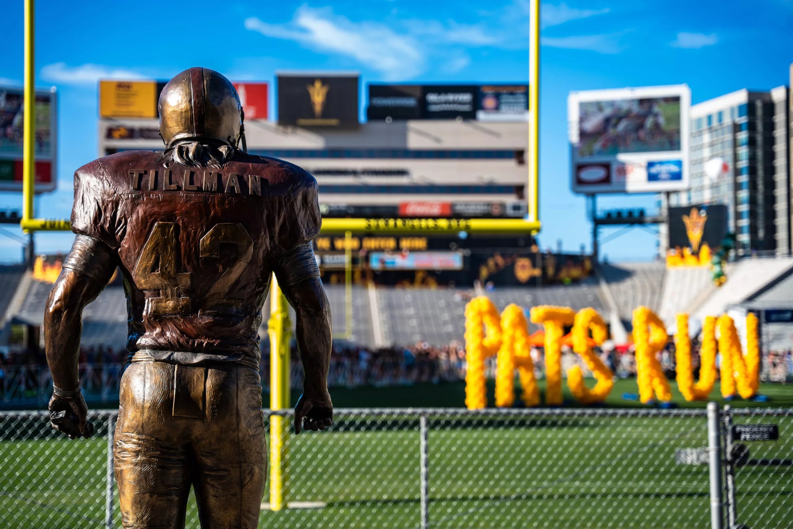 The Pat Tillman statue it Mountain America Stadium was unveiled in 2017 and honors the late Arizona State football player, who lost his life while serving as an Army Ranger.