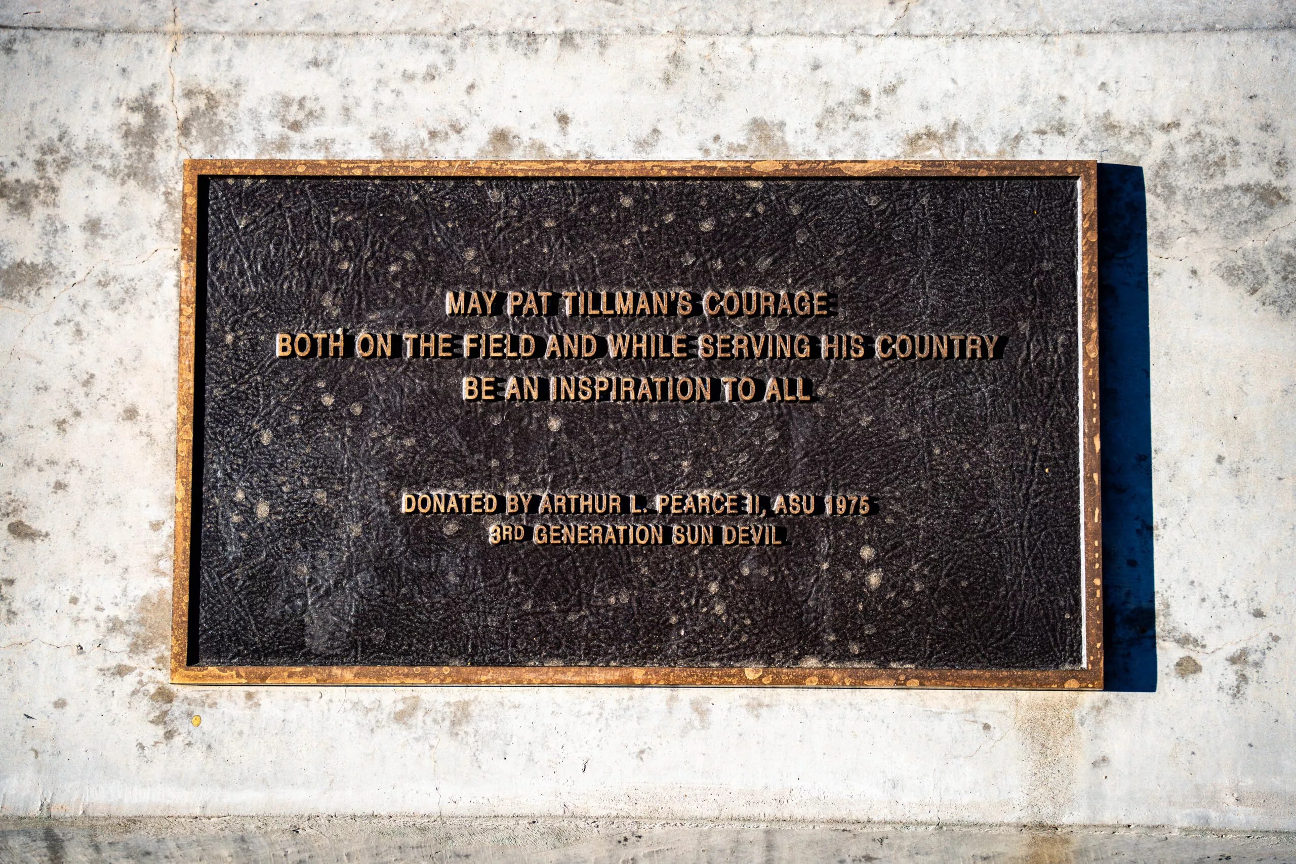 A plaque on the statue honoring Pat Tillman offers a note of encouragement, asking that Tillman’s courage “be an inspiration to all.”