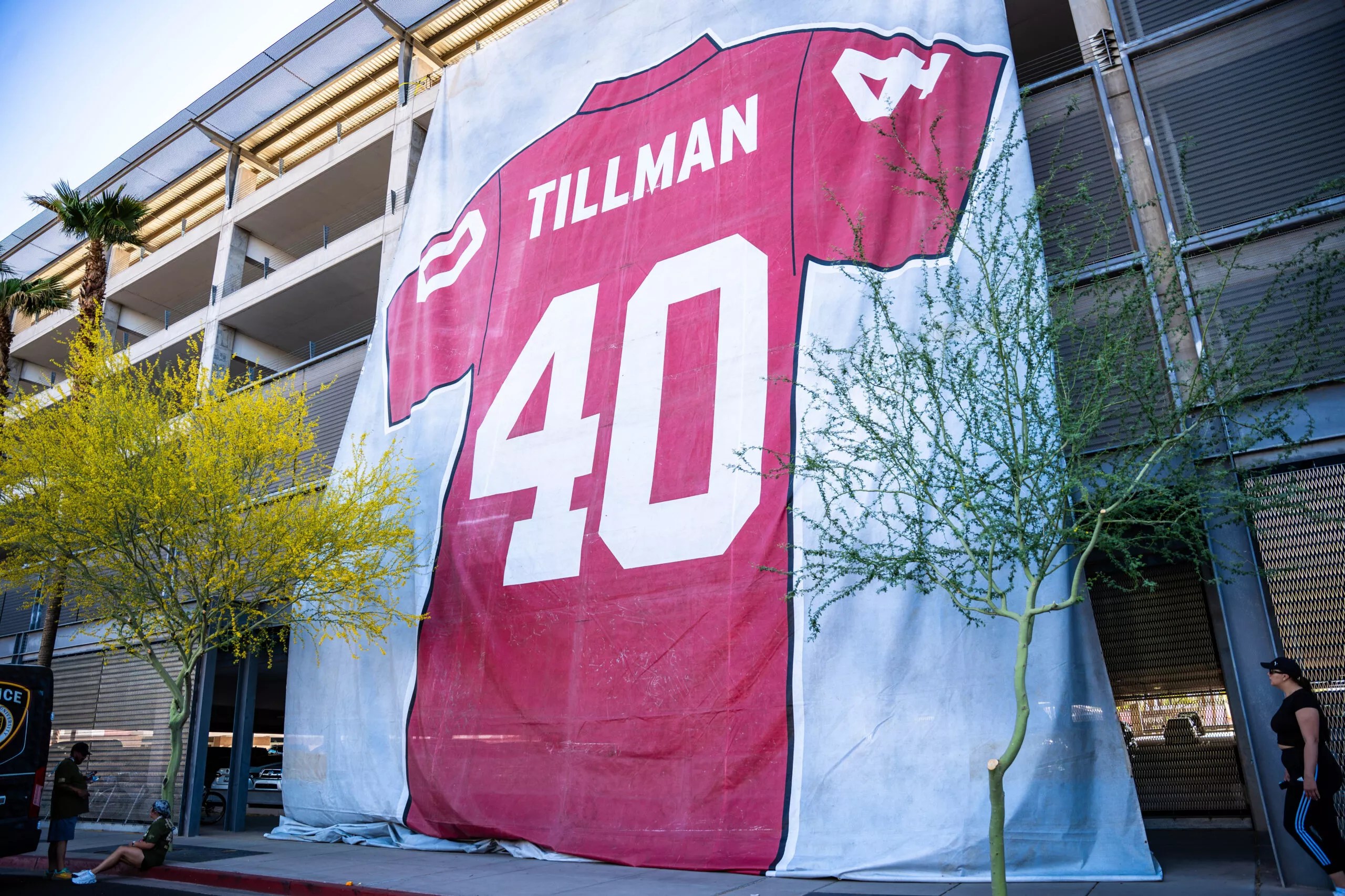 A large rendering of Pat Tillman’s number 40 Arizona Cardinals jersey was on full display at a nearby parking garage.