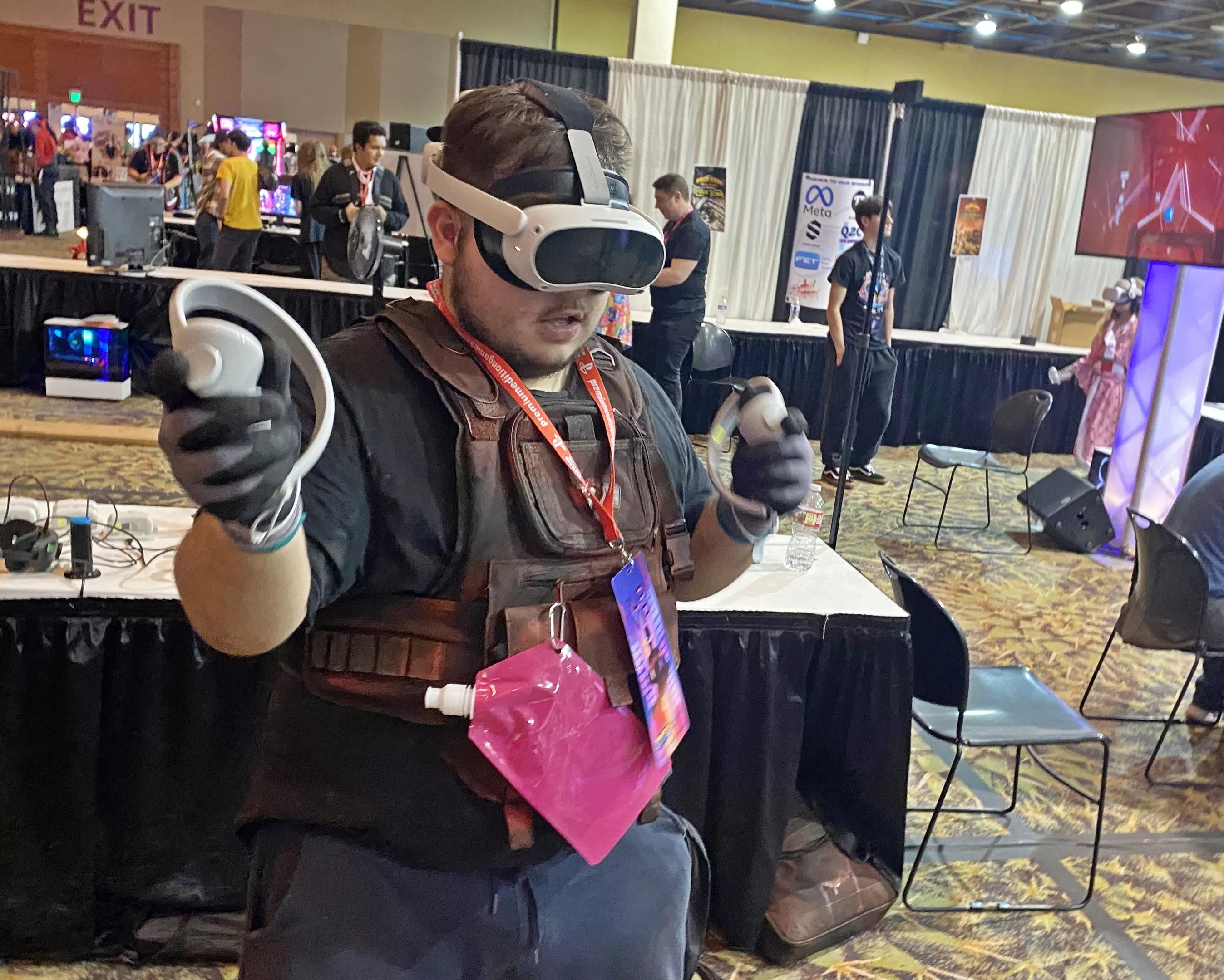 An attendee of Game On Expo 2023 plays one of a few different VR games that were available at the event.