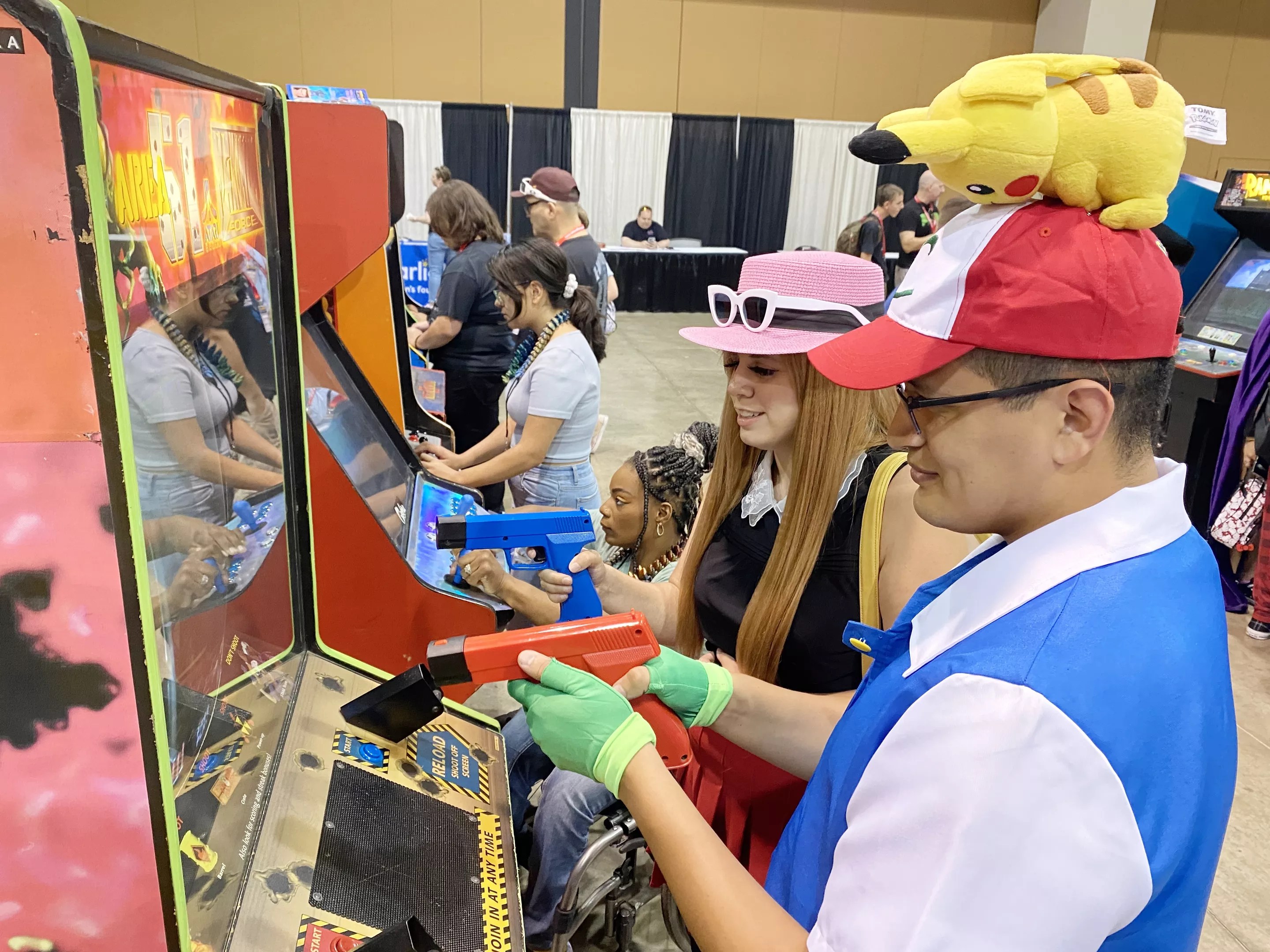 An Ash Ketchum cosplayer (right) shoots ’em all while playing “Area 51” at Game On Expo 2023.