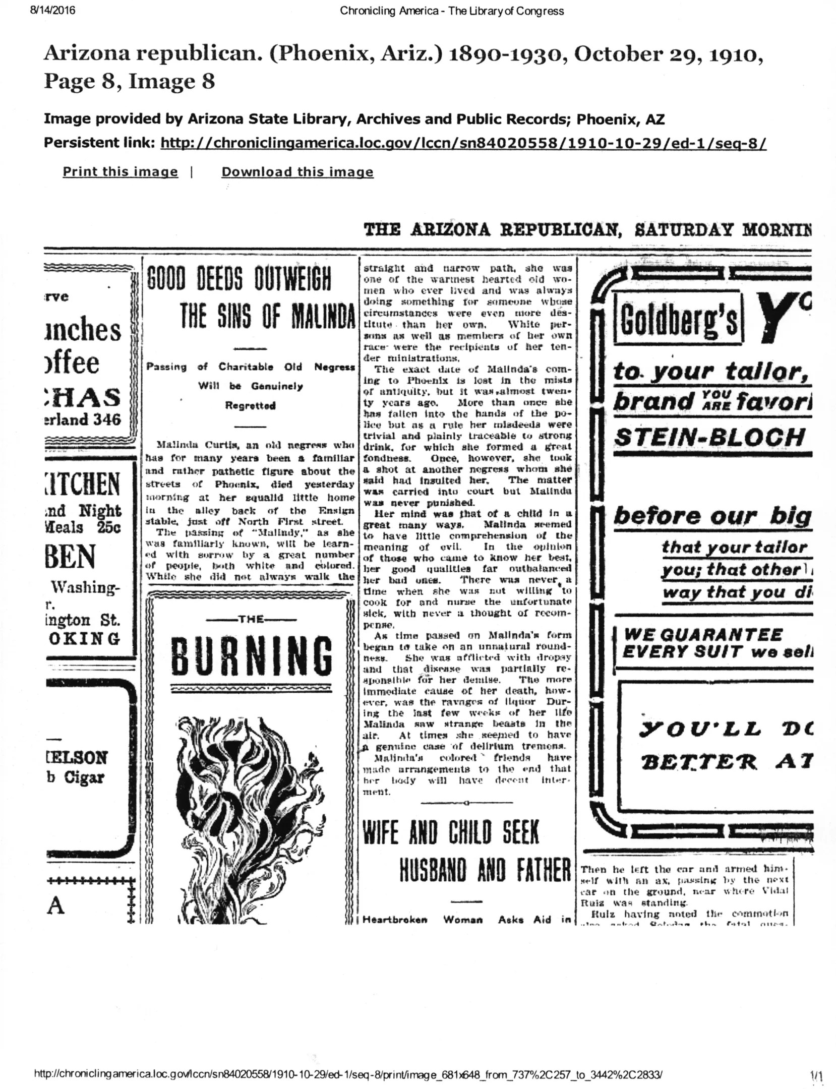 That’s where Hotel Adams was built in 1896, but destroyed by a fire in 1910. According to a newspaper article from the Arizona Republican from October 29, 1910, a woman named Malinda Curtis, who loved to drink and socialize, lived in a nearby alley just off North First Street. Local lore says she was the madam of a brothel for a time.
