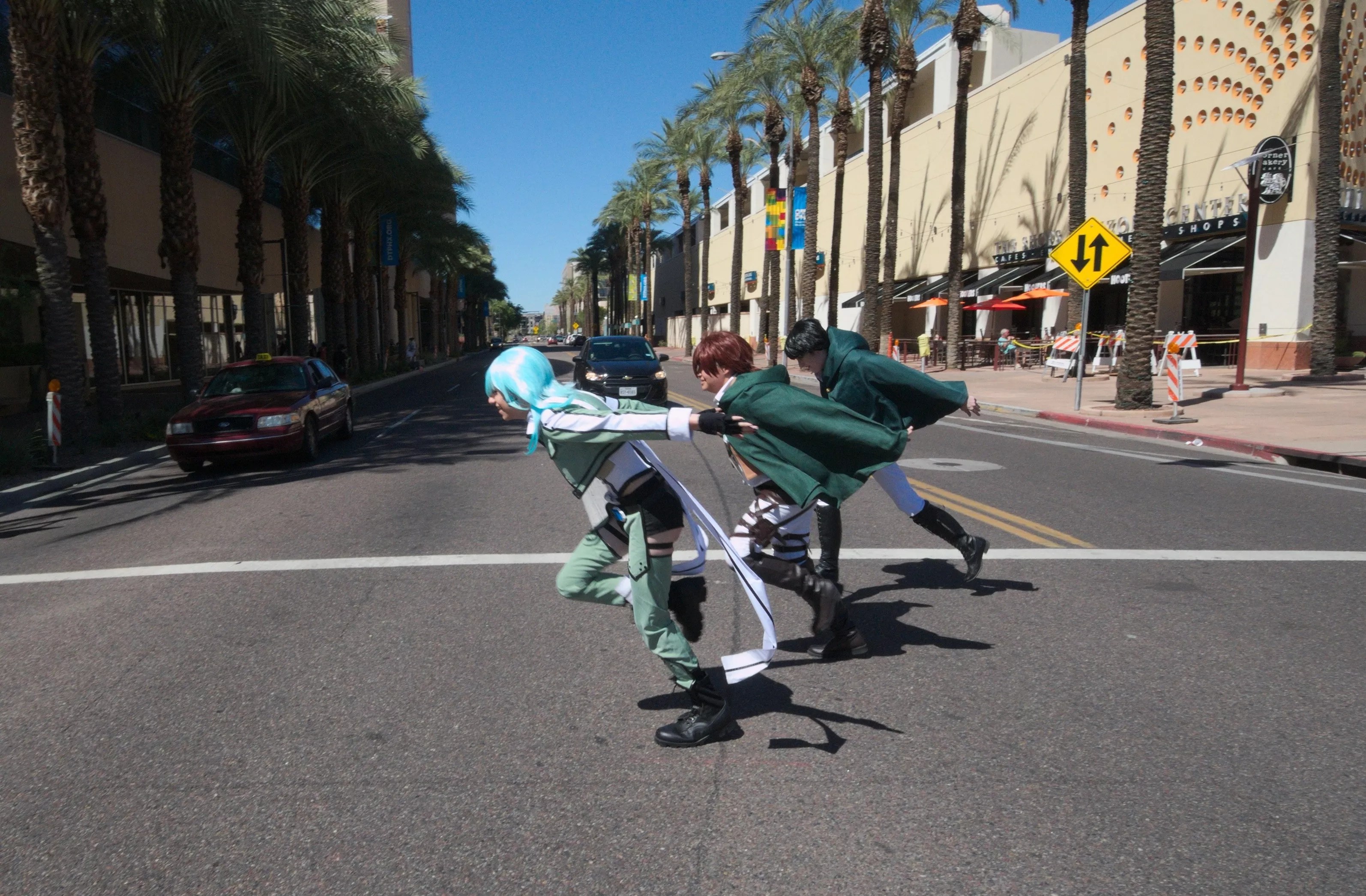 Attack on Titan cosplayers have fun crossing the street at last year’s Saboten Con.