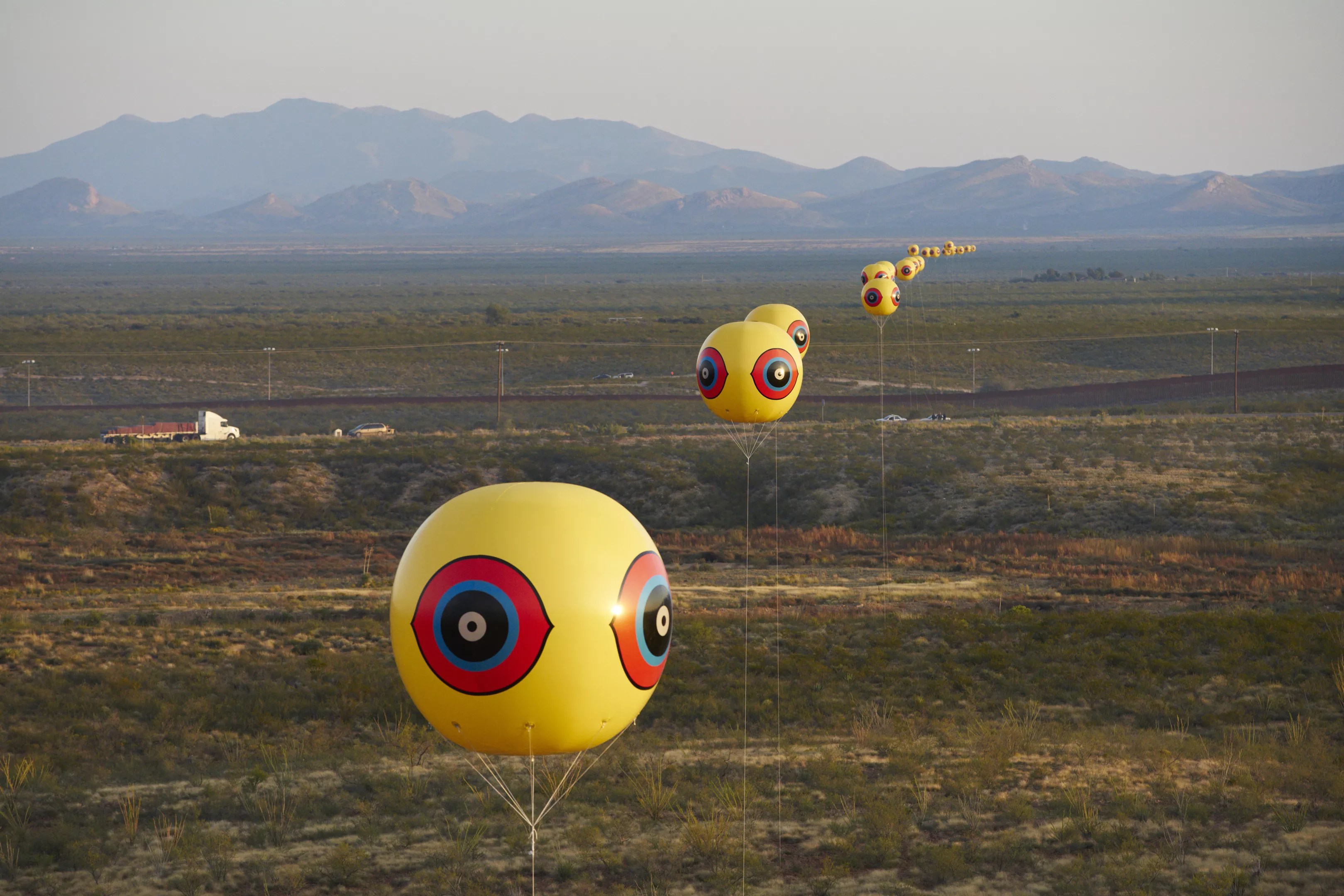 Raven Chacon, Cristóbal Martinez, and Kade L. Twist worked together while they were all part of the Postcommodity collective to create a land art installation called Repellent Fence, using giant “scare-eye” balloons they first discovered when Martinez’s wife used them to repel birds from their Tempe backyard. Their installation conceived as a suture temporarily hovered across the U.S.-Mexico border for several days in October 2015. “The biggest thing artists have is the role of catalyst,” Twist told New Times in 2015.