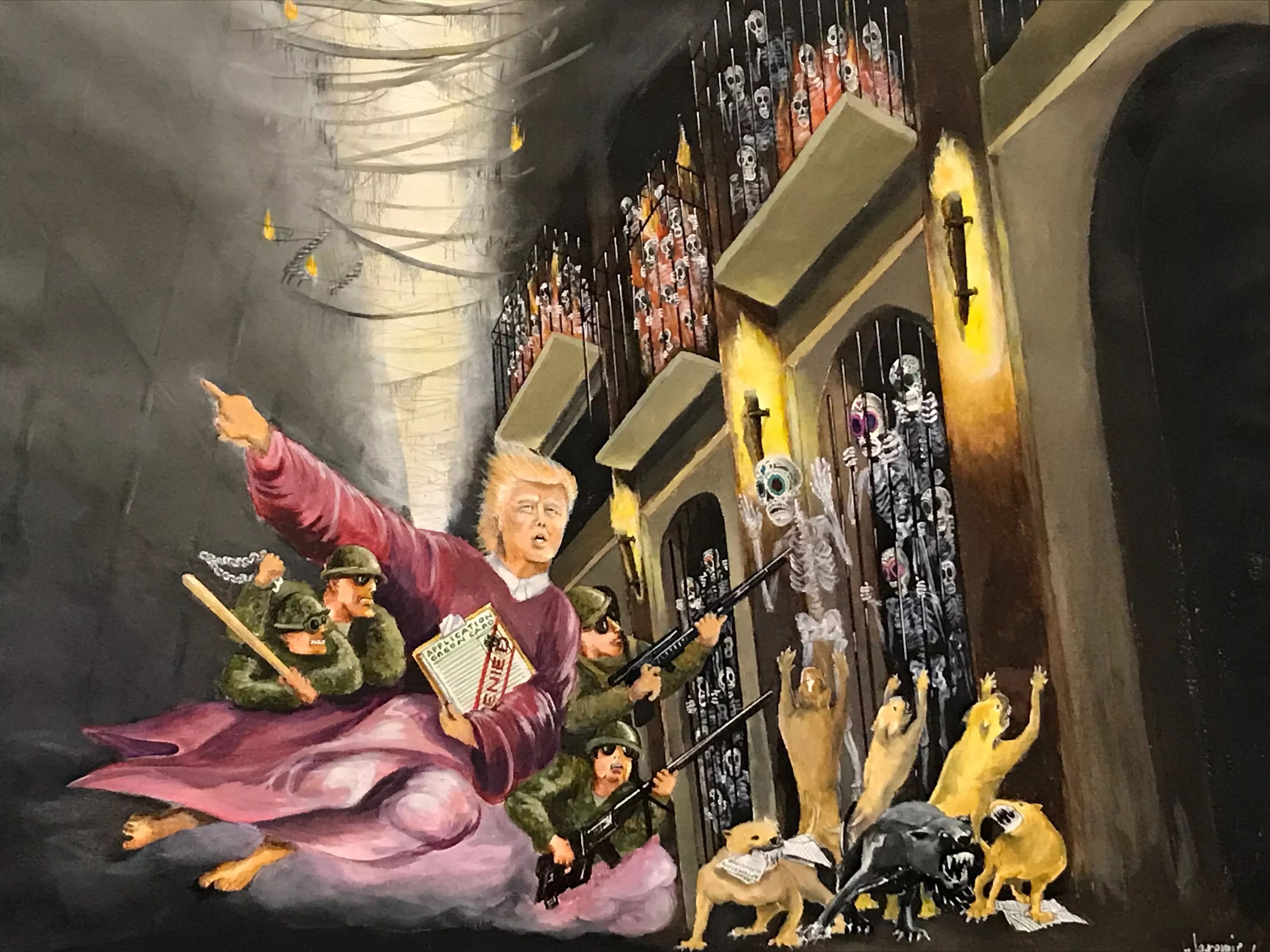 Jeremie “bacpac” Franco created paintings that address Trump-era immigration policies. Her Wall of the Dead depicts the border wall as a morgue where drawers are filled with immigrants who’ve died trying to enter the U.S. Deporter in Chief references Trump’s cloaks of religiosity and militarization. “On the Day of the Dead, in the age of Trump, even the dead need green cards,” Franco says of the piece. “Even the dead are not exempted from SB 1070.”