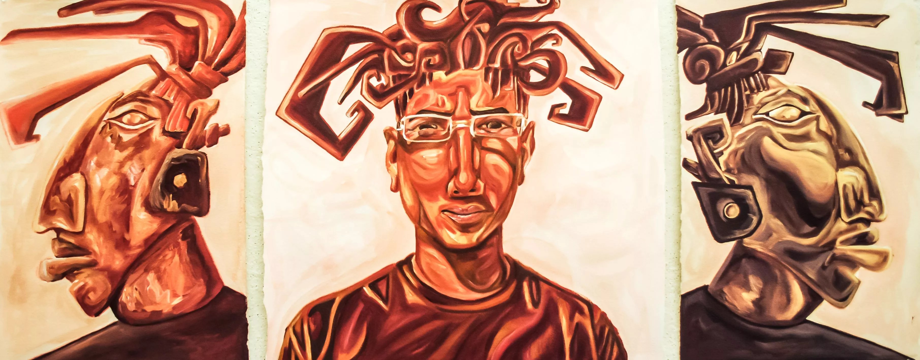 Edgar Fernandez started painting murals exploring his cultural roots after seeing Moreno and other artists making work with social justice themes. “Ten years ago when SB 1070 happened, it was the first time I got introduced to painting murals,” he recalls. “It’s important to me because a lot of indigenous and Chicano art is erased,” he says. Fernandez’s body of work also includes a painting addressing racism called Too Brown for Amerikkka.