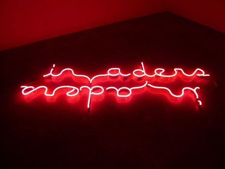 Julio César Morales grew up in Mexico and often traveled across the border as he was growing up. He created a red neon sign that plays with the word “Invaders,” prompting people to reflect on who that word applies to in the context of the borderlands. “Invaders was in a show that we all boycotted because of SB 1070, but one thing I learned is that if you want to make change, you have to do it from within,” he recalls.
