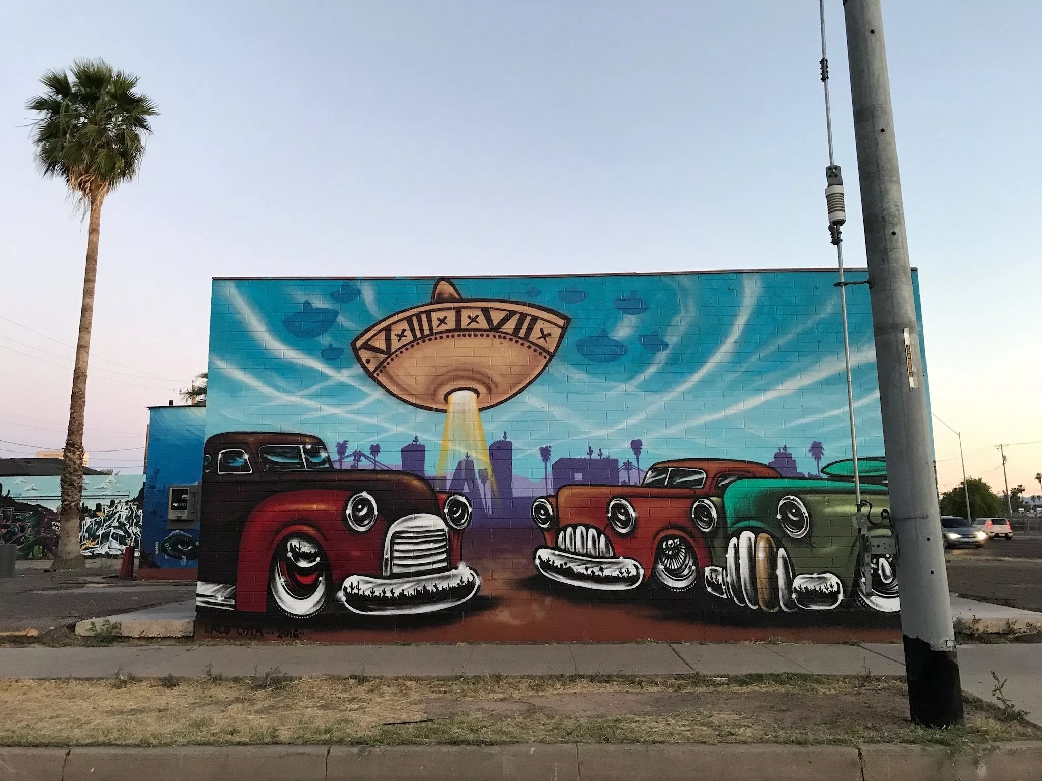 Lalo Cota painted sombreros cast as flying saucers hovering over the desert on a car wash located at Roosevelt Street and Seventh Avenue, only to see it demolished in 2017 to make way for a drive-thru Starbucks. “They’re like the first illegal alien spaceships crossing the desert,” Cota told New Times of his iconic sombrero imagery back in 2011. He’s also painted satirical portraits of SB 1070 personalities Arpaio and Brewer.