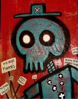 Marco Albarran painted a skeletal figure standing amid protest signs with messages that include “Down With Racism” and “No Mas Muertos.” “Protest art didn’t start with SB 1070,” he says. Albarran was a farm worker before becoming an artist, and recalls being inspired by civil rights activist Cesar Chavez to march decades before SB 1070 was written. “When SB 1070 happened, artists were trying to find a way to have a voice and tell the story of what was going on.”