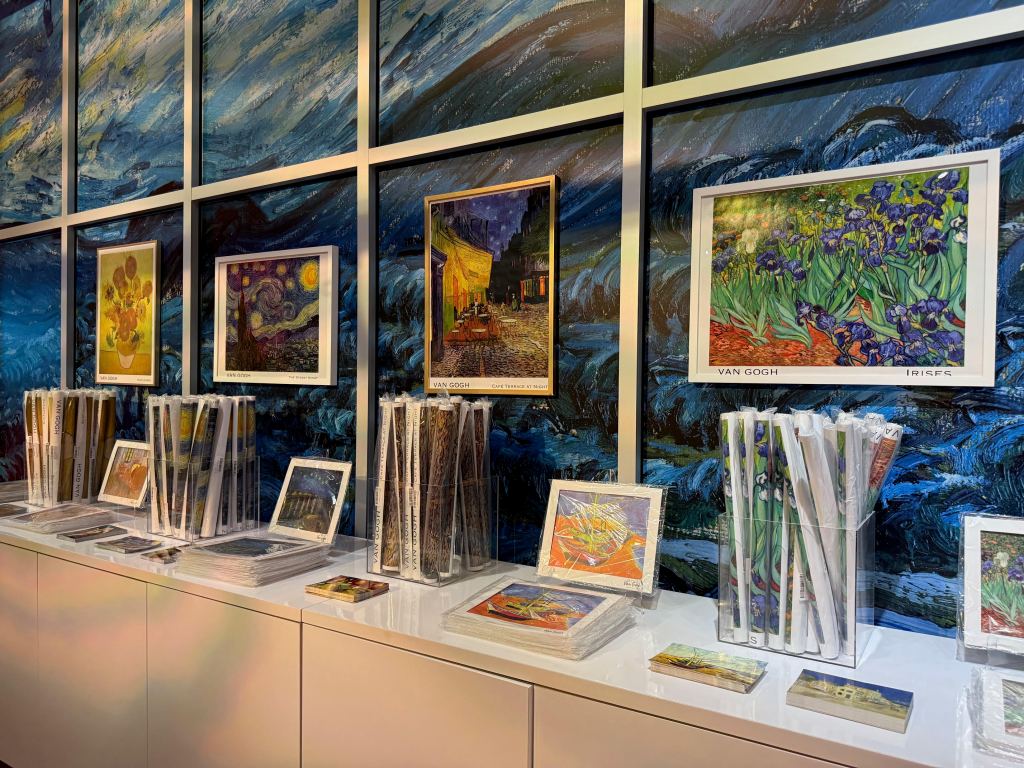 In the final room, the vibrant colors of Van Gogh’s work appear on the walls and the floor of a large space. Paintings such as “Starry Night,” “Wheatfield With Crows,” “Almond Blossoms” and the artist’s many self-portraits move and meld into one another to thrill the eye. When visitors have had their fill, they move, inevitably, into a gift shop filled with T-shirts, postcards and other souvenirs.