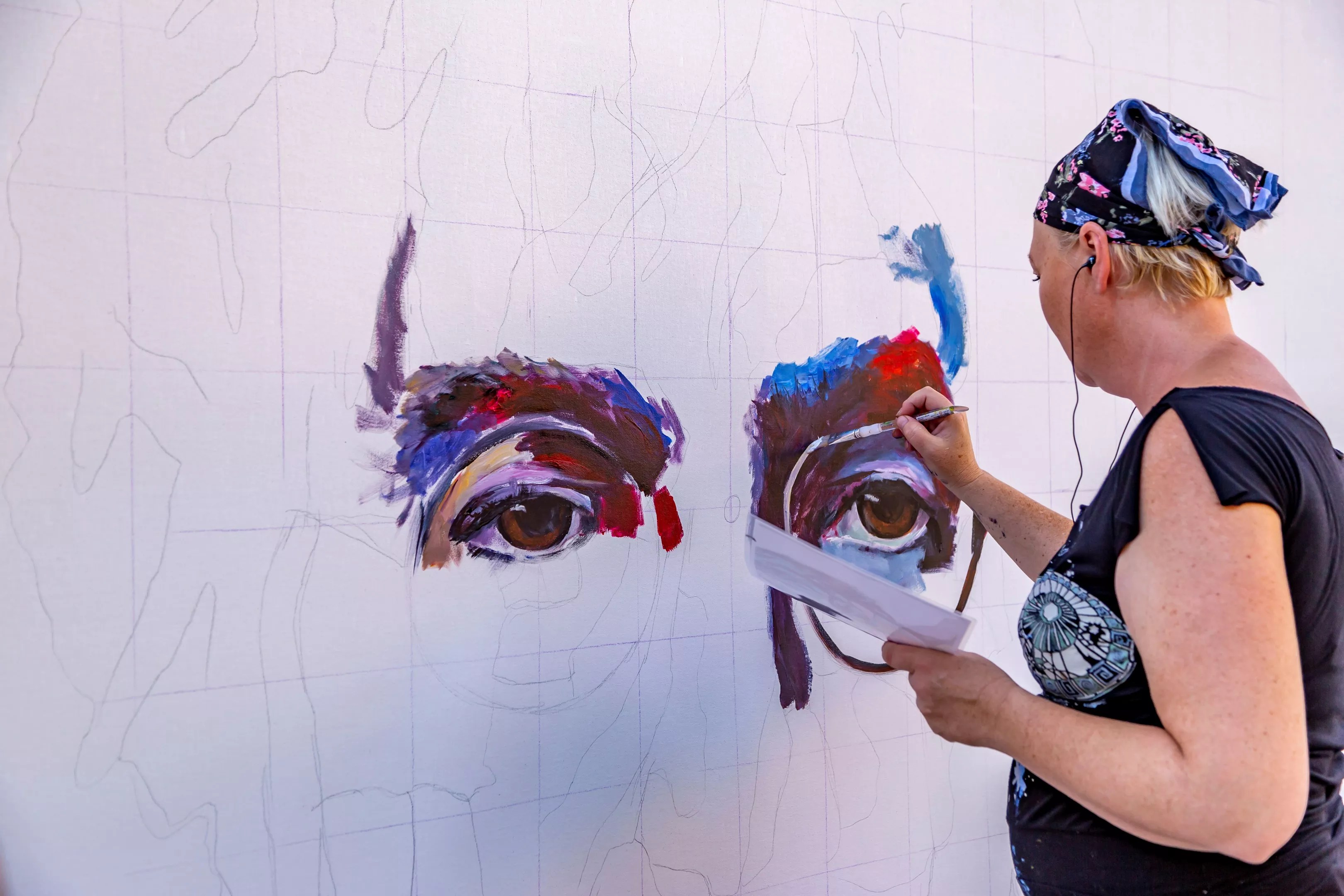 Gina Ribaudo painting one of her musician murals at Tempe Marketplace.