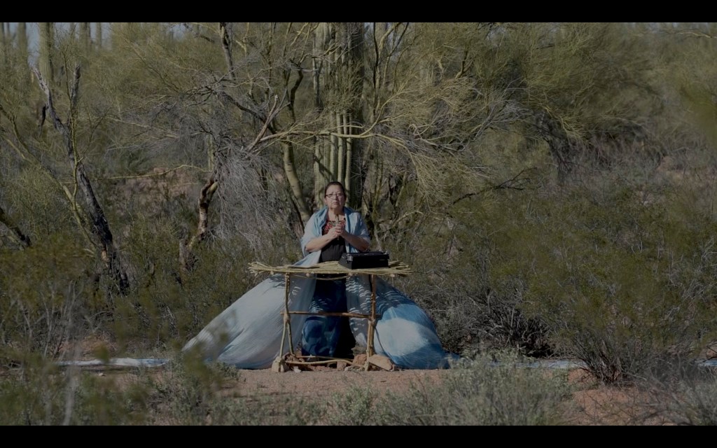 Pineda performed the ceremony over the course of many visits to Ironwood Forest National Monument, at different times of day, so that the video chronicles a recitation of names as well as the day’s journey into night, with the camera farther and farther from her as the daylight wanes.