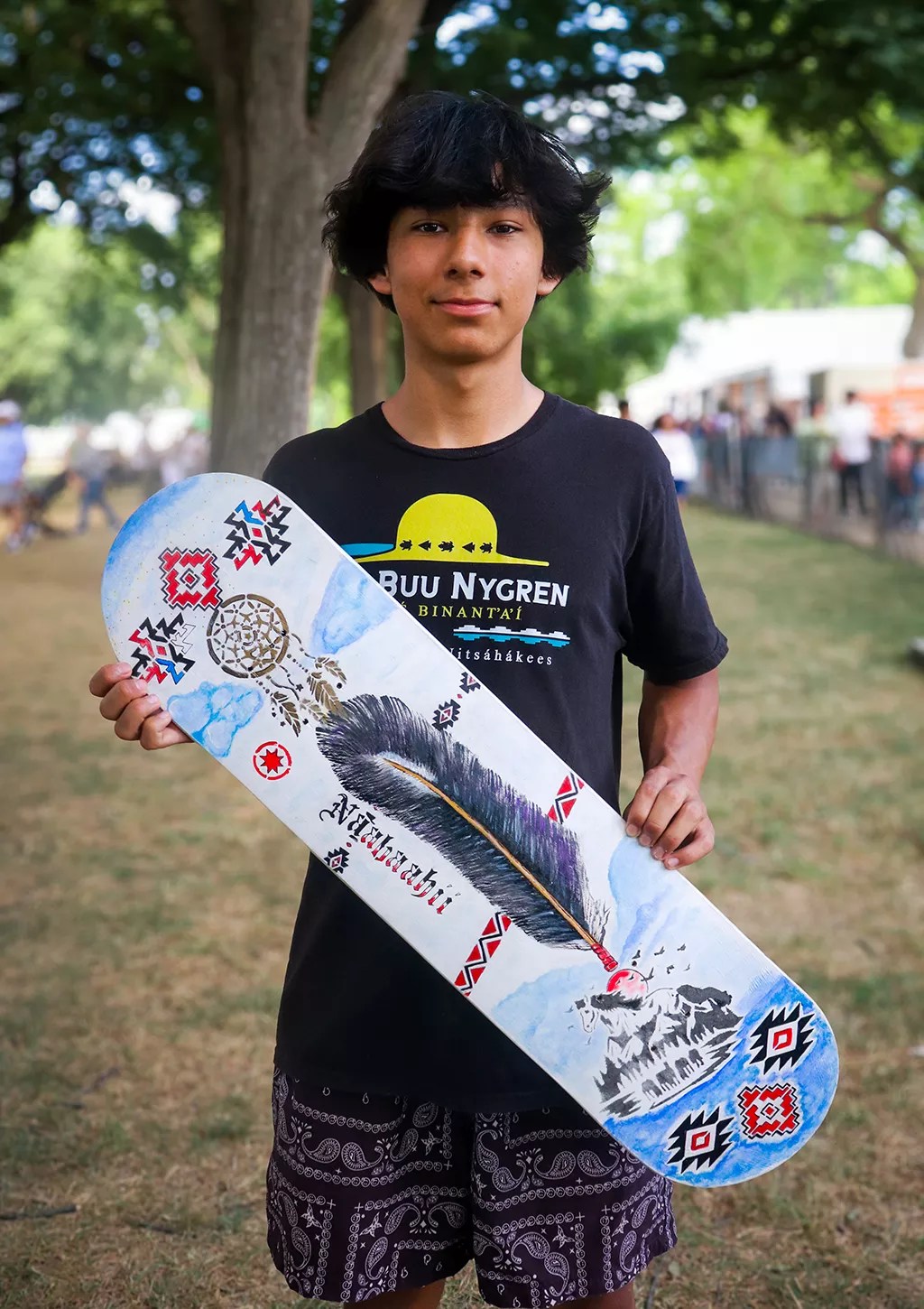 Charles Cronyn showing off a handmaid skate deck given to him by his boxing instructor. The designs symbolize his Navajo heritage and a coming-of-age vision quest he recently embarked on.