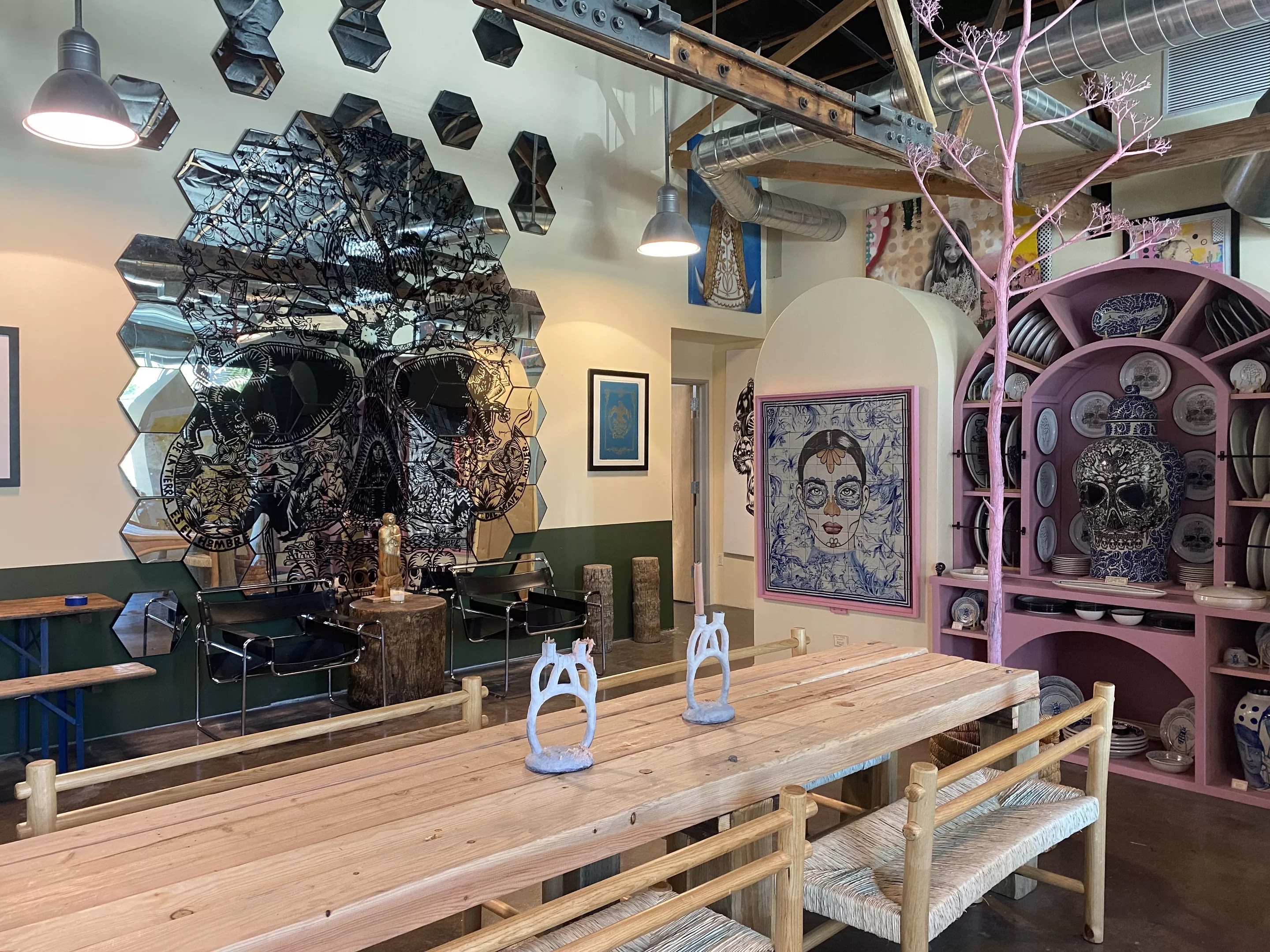 He’s done the interior design for Taco Chelo on Roosevelt Row, which he co-owns with Aaron Chamberlin and Suny Santana; Ghost Ranch in Tempe; seven locations of Barrio Queen; and others. At Talavera at the Four Seasons Scottsdale, he created a mural and displays work for sale.