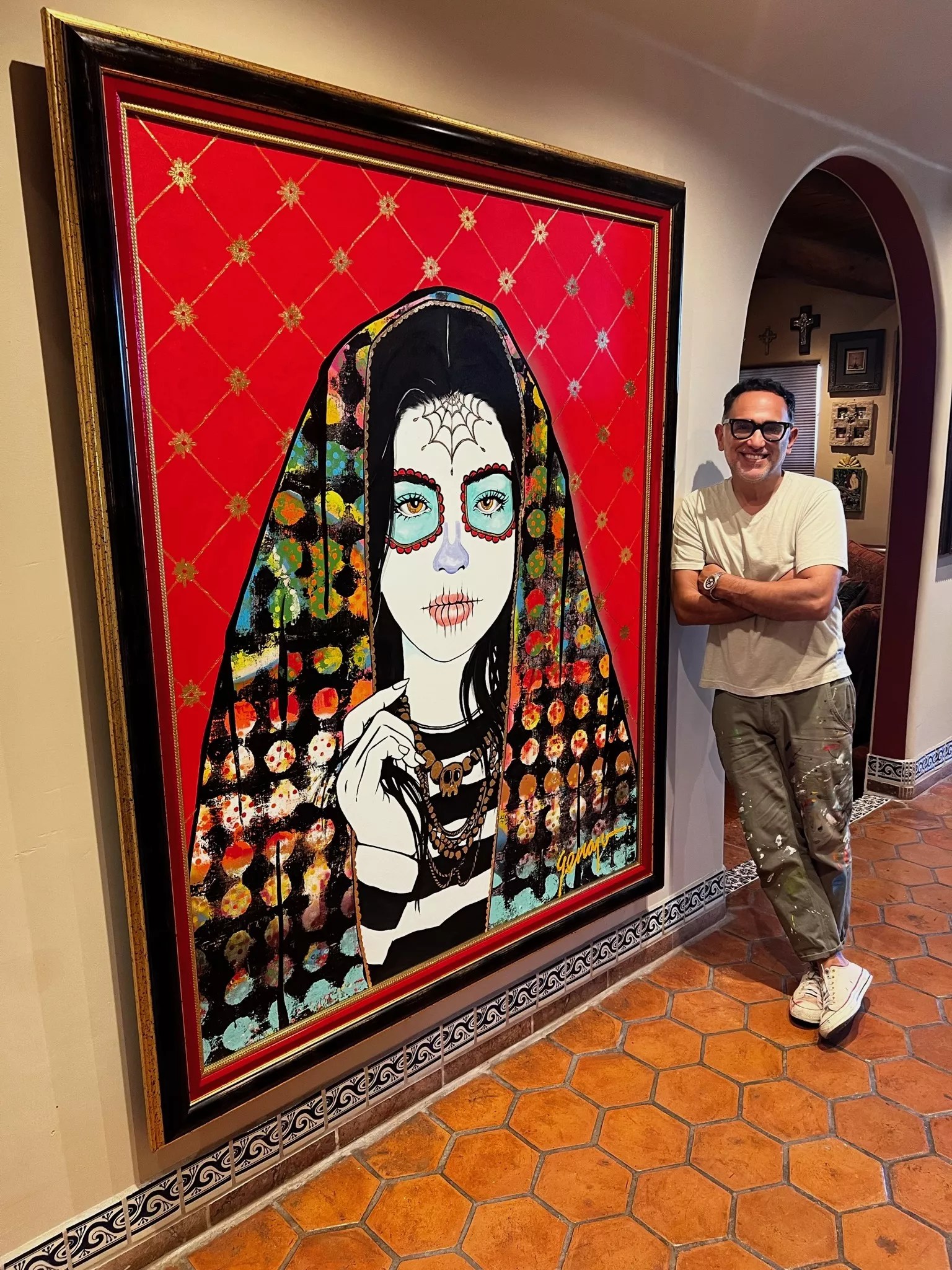 Gennaro Garcia stands next to his painting "Santita Muerte," which collector José Cárdenas purchased.