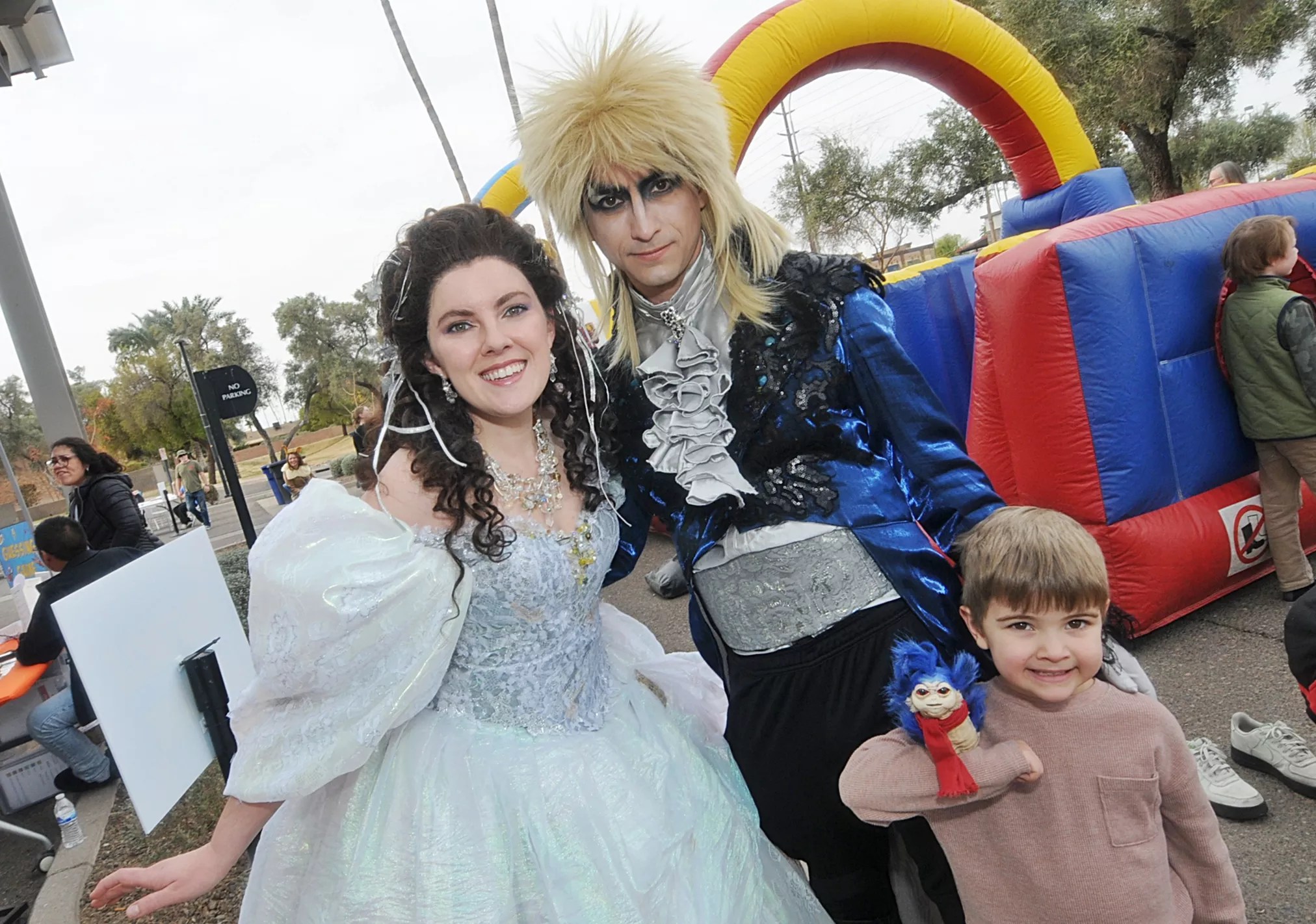 Gilbert resident Amberlyn Cioara went all out creating hand-sewn costumes for her family from the 1986 cult classic “Labyrinth.” She dressed up in a flowing white ball gown worn by actress Jennifer Connelly while her husband, Johnny Cioara, came as Jareth the Goblin King.