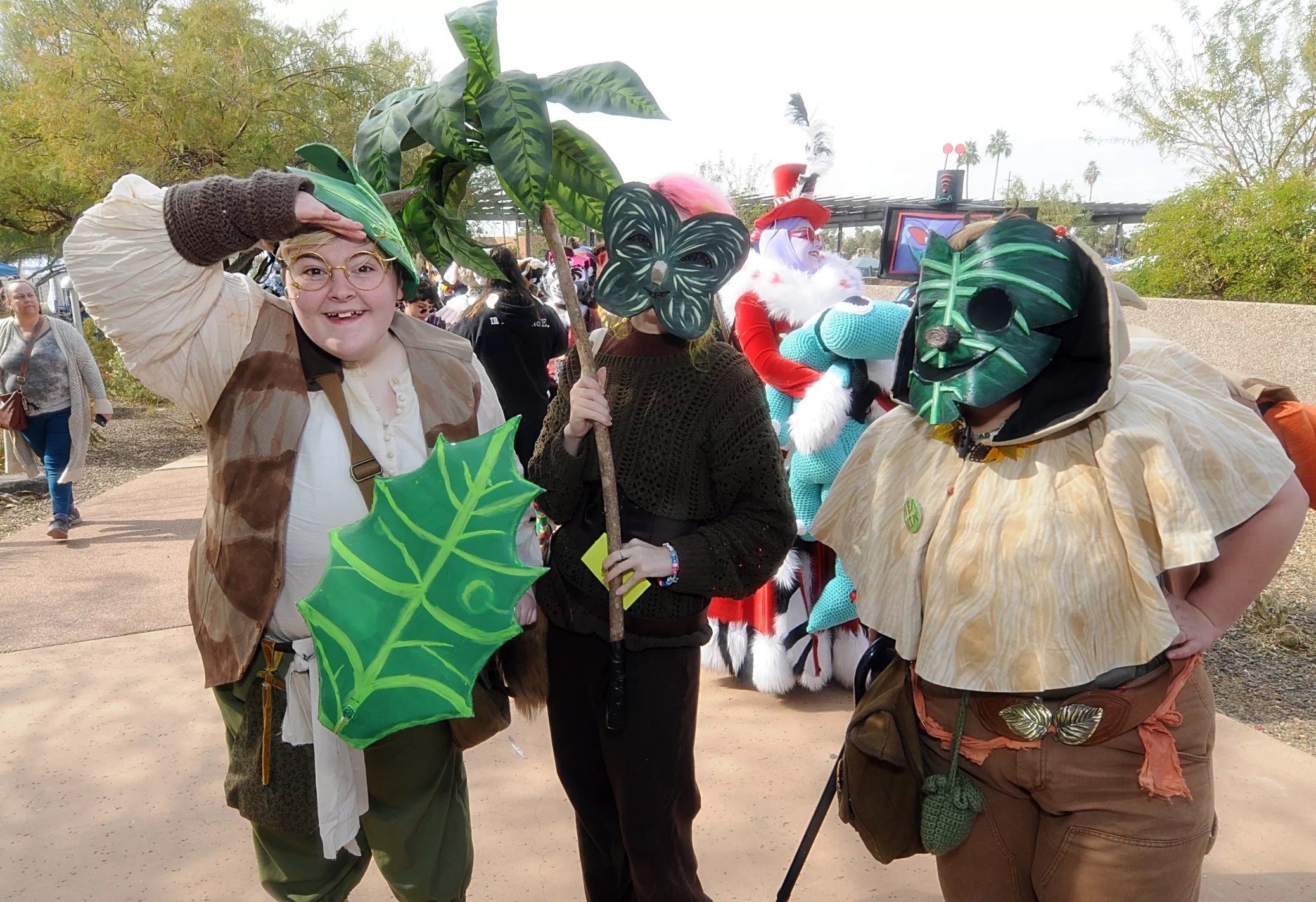 Felix Bowen of Tempe, left, CJ Jones of Phoenix, center and Kai Davis of Tempe cosplayed Koroks from “The Legend of Zelda” games “Breath of the Wild” and “Tears of the Kingdom.”