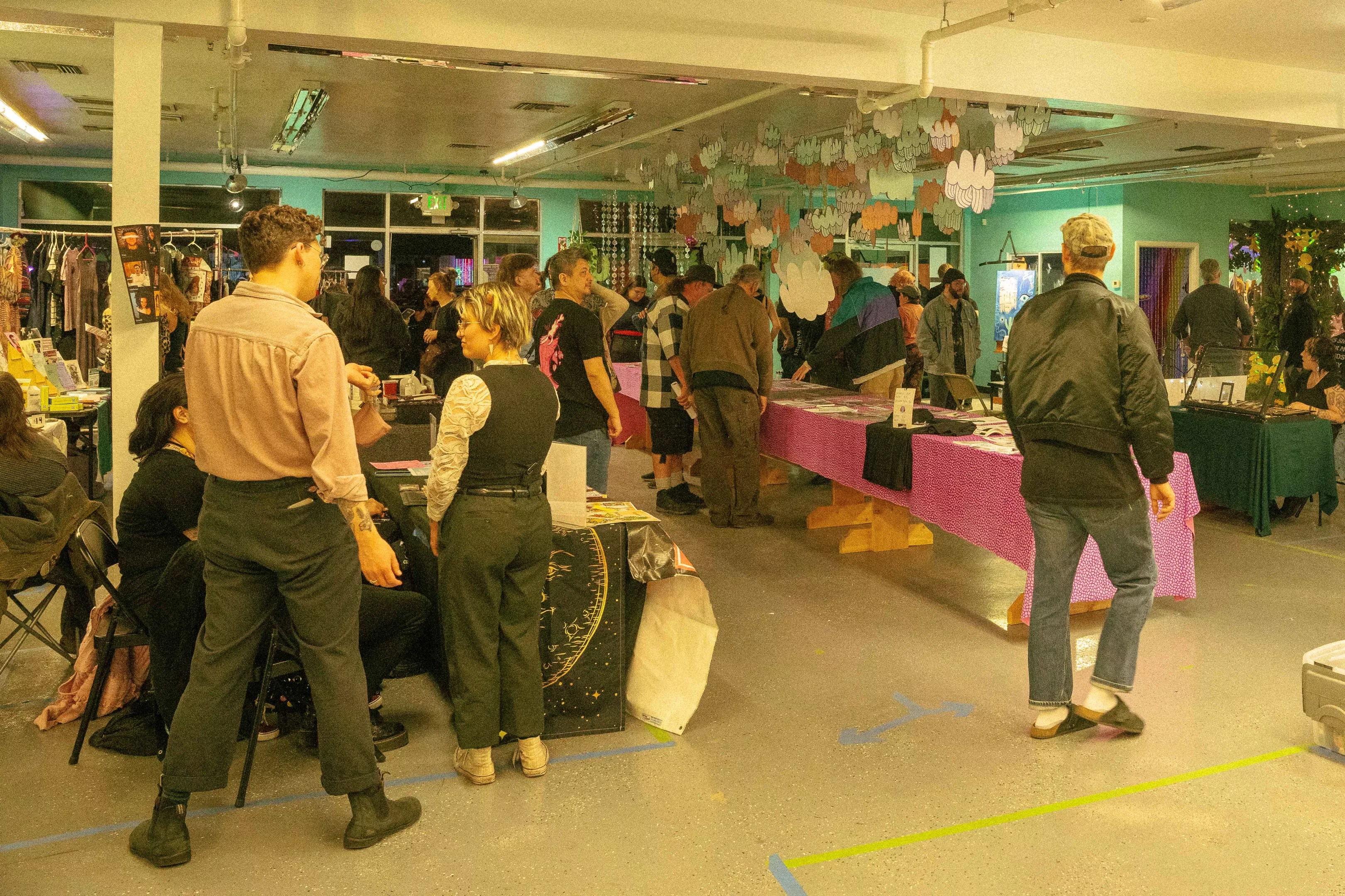 Visitors mill about in Rocket Space Gallery at Danelle Plaza on Jan. 31 during “Powers Out,” an art show and market celebrating the seventh anniversary of the Danelle Project.