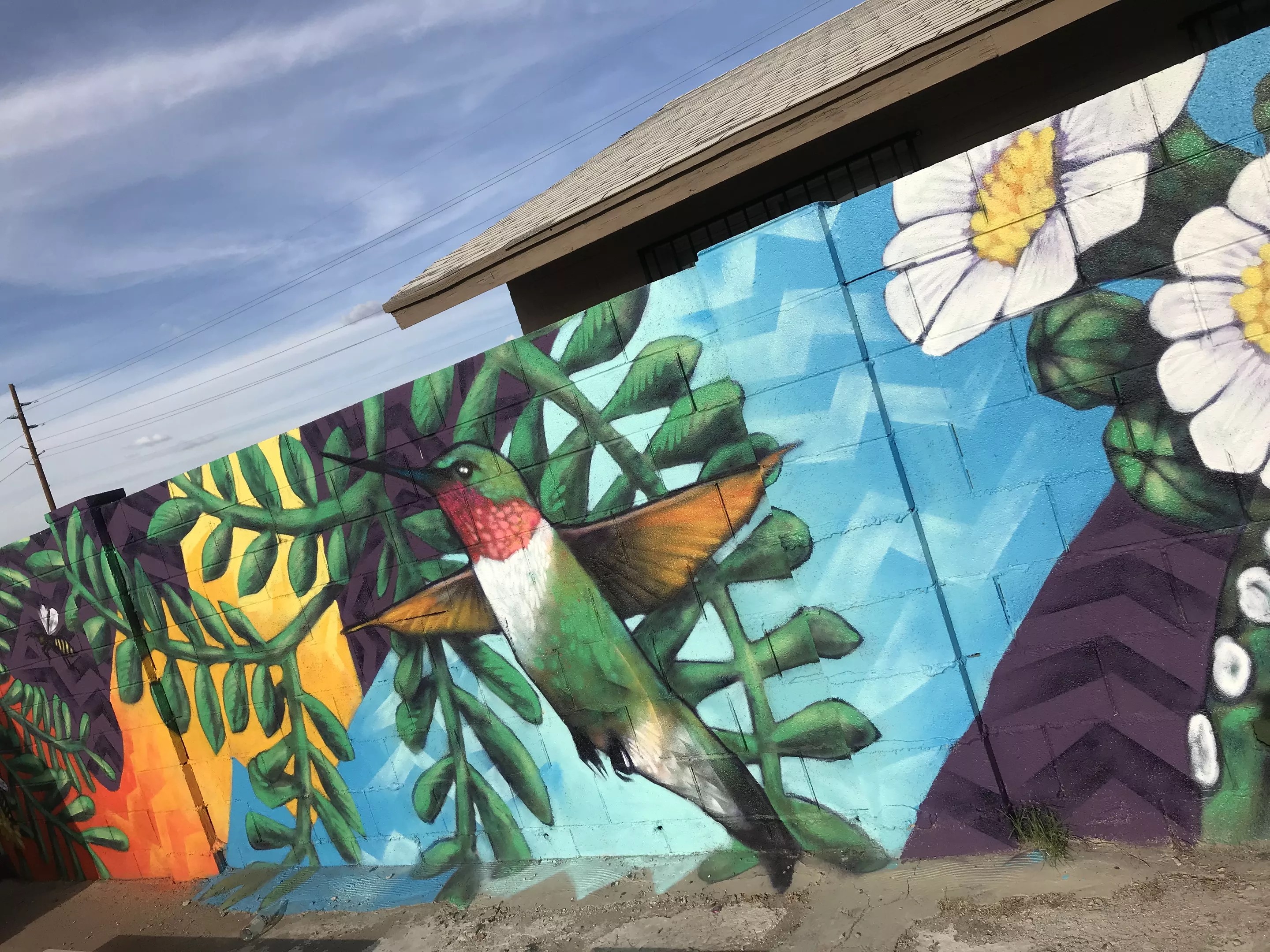 Miguel Angel Godoy painted a cheerful array of desert plants as part of a larger collaborative work that also includes several images that reference the history of the region. The majority of the mural, which is located on Grant Street west of Seventh Street, was painted between March and October. It enlivens the surrounding warehouse district.